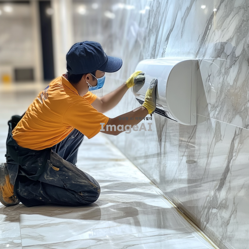 대리석 바닥을 보수하는 장인, 대리석의 광택을 되살리는 과정, 정교한 손길로 대리석의 결함을 보수하는 모습, 고급스럽고 세련된 인테리어