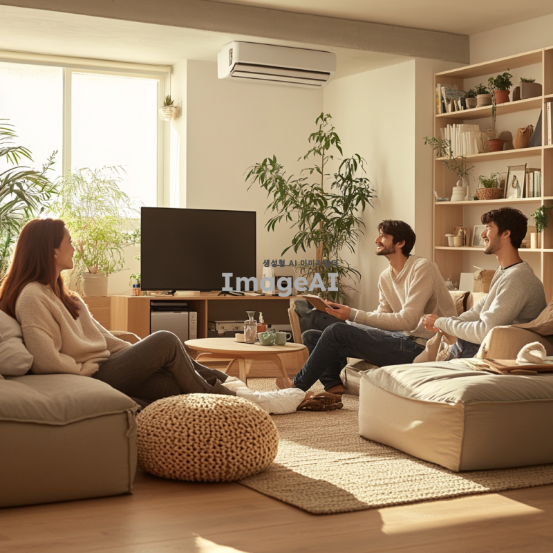 따뜻하고 아늑한 가정 환경에서 편안하게 휴식을 취하는 사람들, 부드러운 조명과 자연스러운 색감, 편안한 가구와 식물들이 조화를 이루는 실내 공간, 가족과 함께 웃으며 대화하는 장면, 현대적이면서도 친근한 느낌의 홈케어 제품들이 배치된 장면, 건강과 웰빙을 강조하는 분위기.