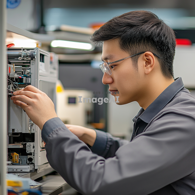 최신 가전제품을 전문적으로 관리하는 기술자, 현대적인 작업 공간에서 세심하게 가전제품을 점검하고 있는 모습, 깔끔하고 조직적인 작업 환경, 첨단 도구와 장비, 전문적인 분위기, 밝고 환한 조명, 기술자의 집중된 표정과 디테일한 작업 과정, 가전제품의 정밀한 부품들이 돋보이는 장면.