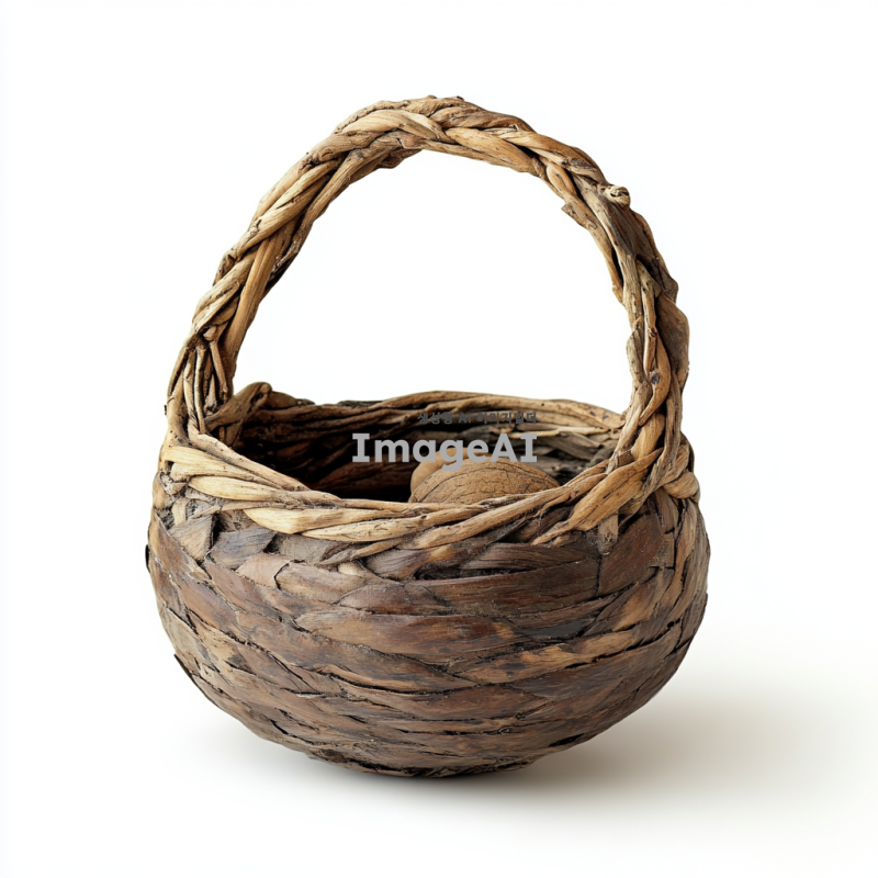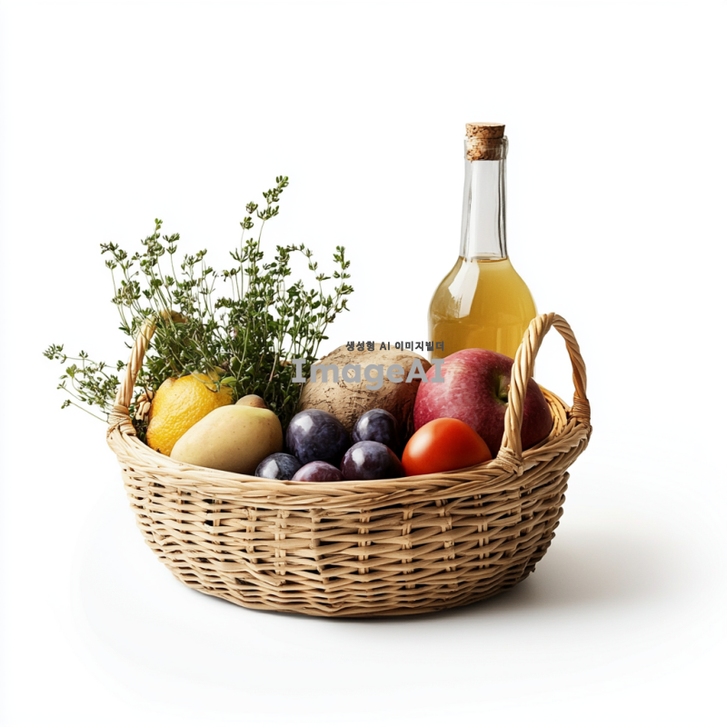 흰색 배경 위에 놓인 단일 물체, 고해상도, 선명한 디테일, 그림자 최소화, 자연광 사용, 물체의 모든 면이 잘 보이도록 중앙에 배치, 물체의 본래 색상이 잘 드러나도록 조명 조절.바구니와 바구니에담긴것들을 제외하고 배경 전부제거