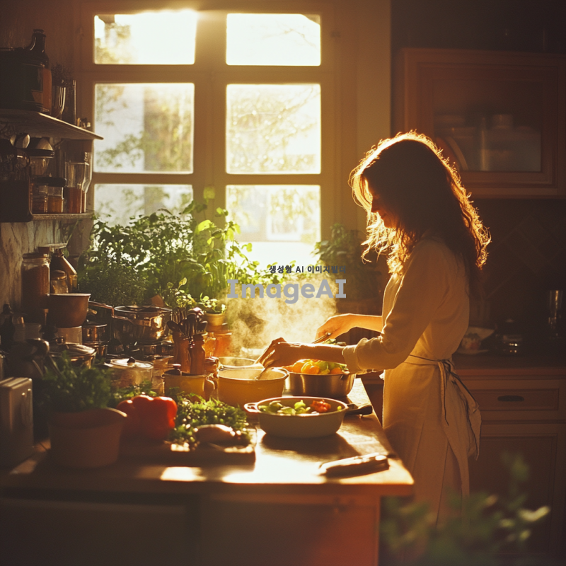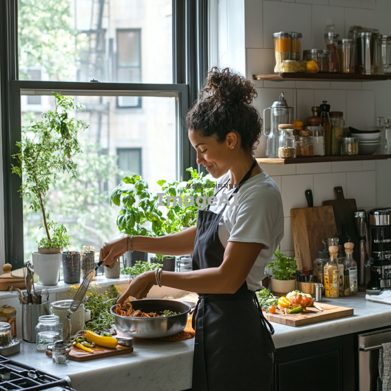 따뜻한 주방에서 요리하는 중인 사람, 신선한 재료들이 가득한 조리대, 밝고 환한 조명 아래에서 다양한 향신료와 허브를 사용하여 요리를 준비하는 모습, 주방 도구들이 깔끔하게 정리된 공간, 활기찬 분위기의 현대적인 주방 인테리어, 요리에 집중하는 모습, 행복한 표정, 창문을 통해 들어오는 자연광, 요리의 향기가 가득한 공간.