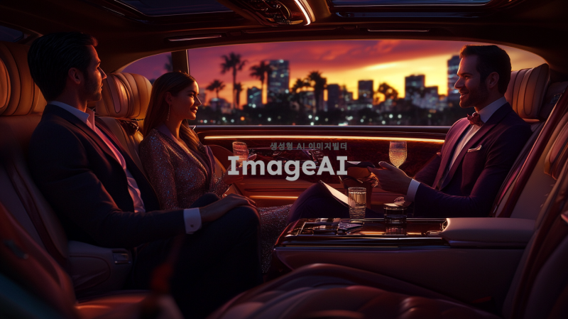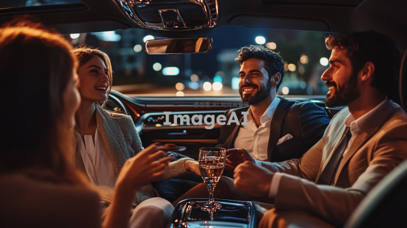 세련된 자동차 내부, 세 명의 남성과 여성이 편안하게 앉아 있는 모습, 자연스럽고 즐거운 대화 나누는 장면, 현대적인 의상과 스타일, 차창 밖으로 보이는 도시 풍경, 따뜻한 조명과 고급스러운 분위기.