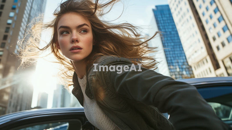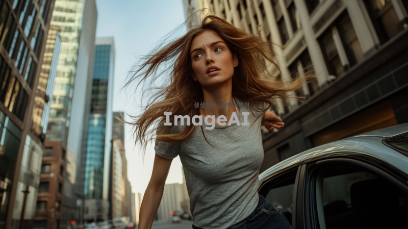 도심의 주차장에서 차 문을 열고 서둘러 나오는 여성, 긴 머리가 바람에 흩날리며, 캐주얼한 옷차림, 주변에 고층 빌딩들이 보이는 배경, 긴장된 표정과 빠른 동작이 강조된 장면, 일상적인 도시의 분위기와 조화롭게 어우러진 색감.