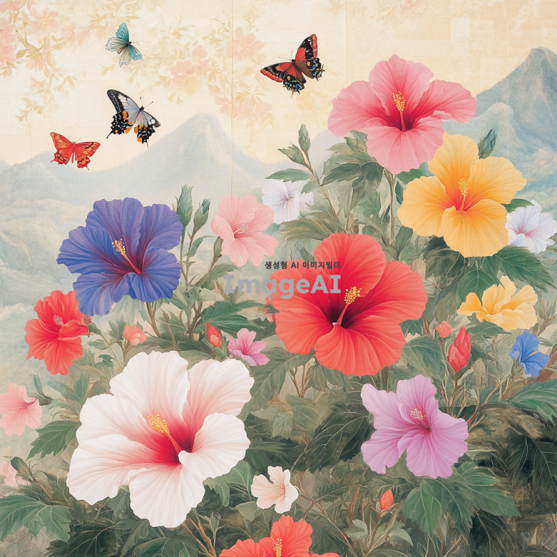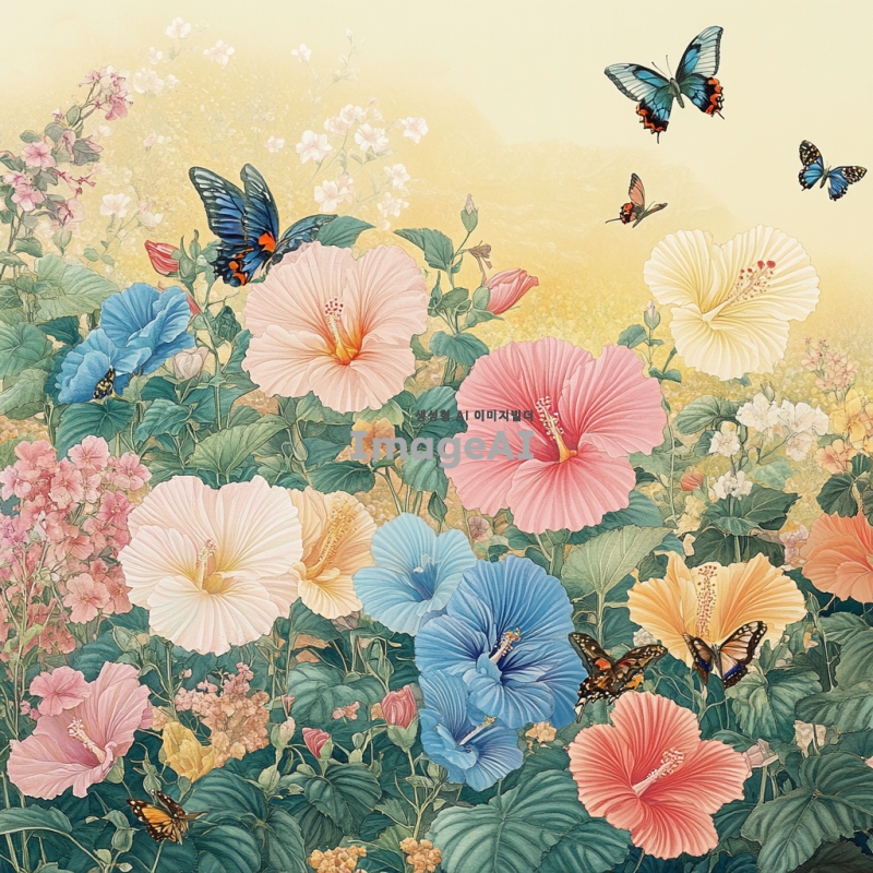 무궁화가 만개한 아름다운 정원을 배경으로, 햇살이 부드럽게 내리쬐는 아침 풍경. 다양한 색상의 무궁화가 조화롭게 어우러져 있으며, 나비와 벌들이 꽃 주변을 날아다니는 모습. 한국 전통 정원의 정취가 느껴지는 섬세한 디테일 강조.