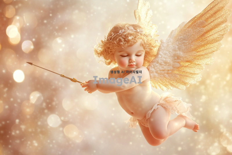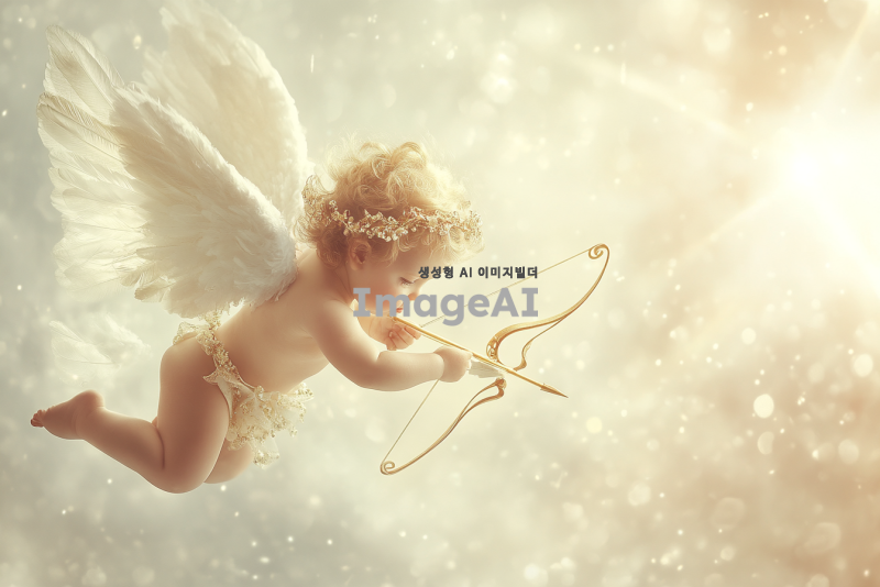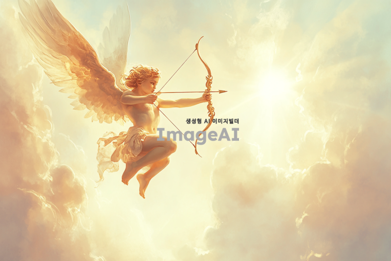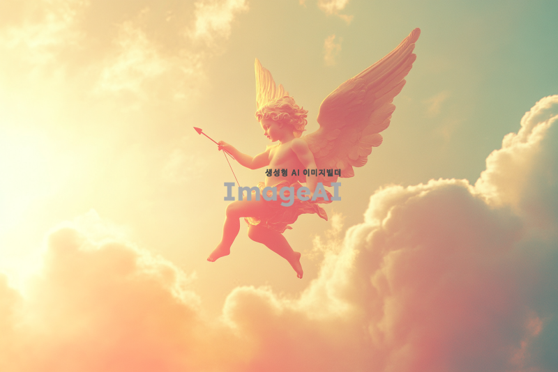 천사의 날개와 화살을 가진 사랑의 신 큐피트가 하늘을 날고 있는 장면, 밝고 부드러운 파스텔 톤의 배경, 구름 사이로 빛나는 햇살, 큐피트는 아래를 보고 있고 몽환적이고 신비로운 분위기.