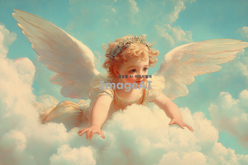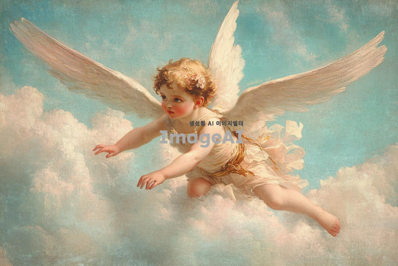 천사 같은 날개를 가진 사랑의 신 큐피트, 장난기 넘치는 표정, 하늘을 나는 장면, 부드러운 파스텔 색조의 배경, 고전적인 예술 스타일, 로맨틱하고 환상적인 분위기,구름 아래를 보는 큐피트.