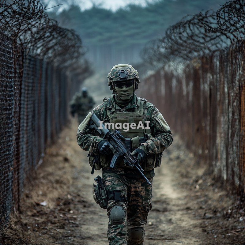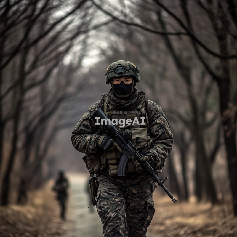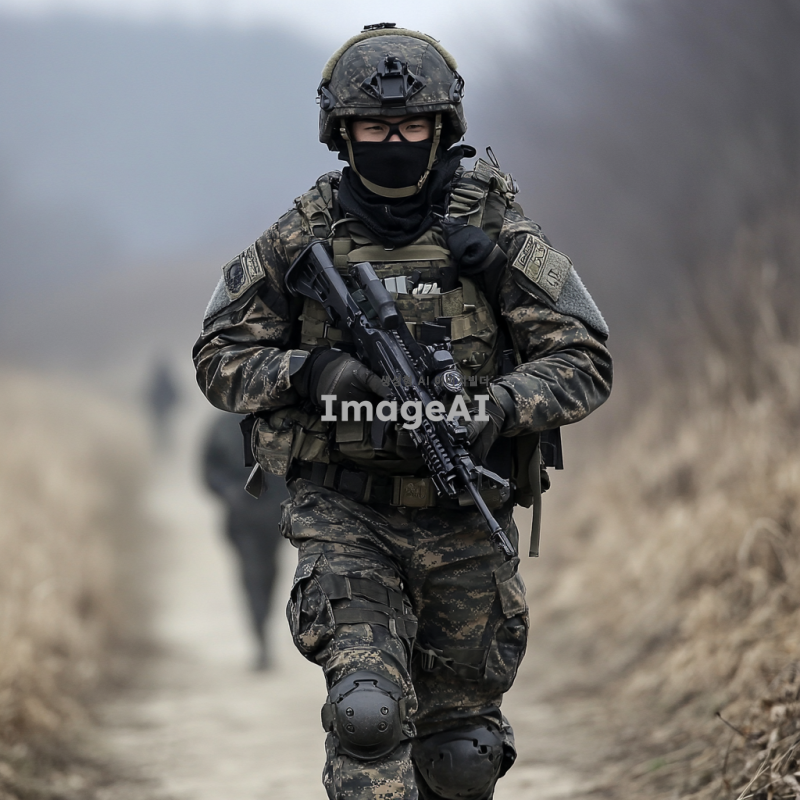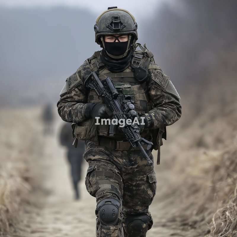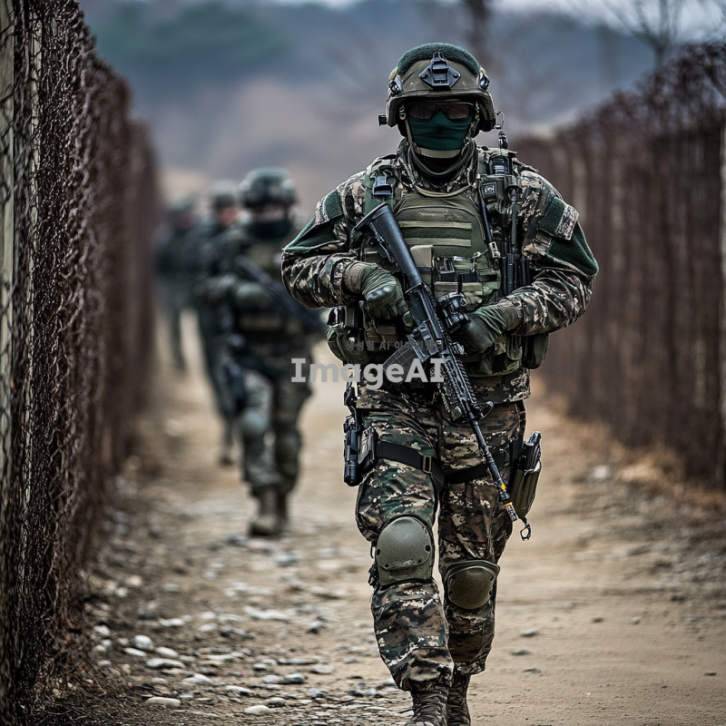 DMZ에서 권총을 전방으로 겨누고 걸어가는 대한민국 특수부대 요원