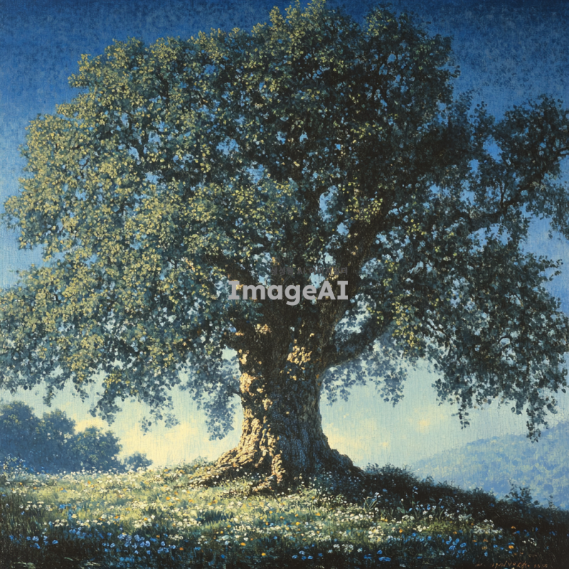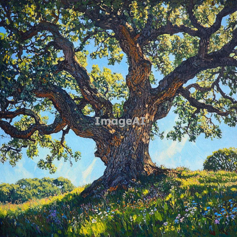 푸른 하늘 아래 서 있는 거대한 참나무, 햇빛이 나뭇잎 사이로 비쳐 아름다운 그림자를 만드는 모습, 나무 주위에는 작은 야생화들이 피어 있고, 나무의 질감과 나뭇잎의 세밀함이 잘 드러나도록 표현, 평화롭고 자연적인 분위기, 고요한 숲 속의 느낌.