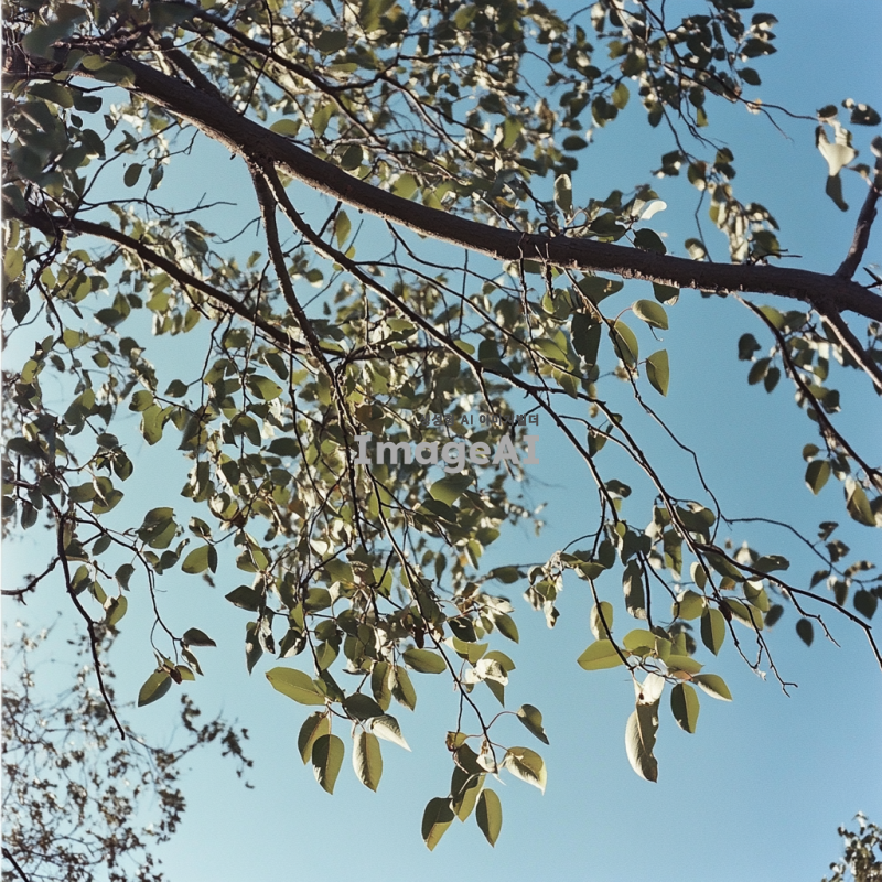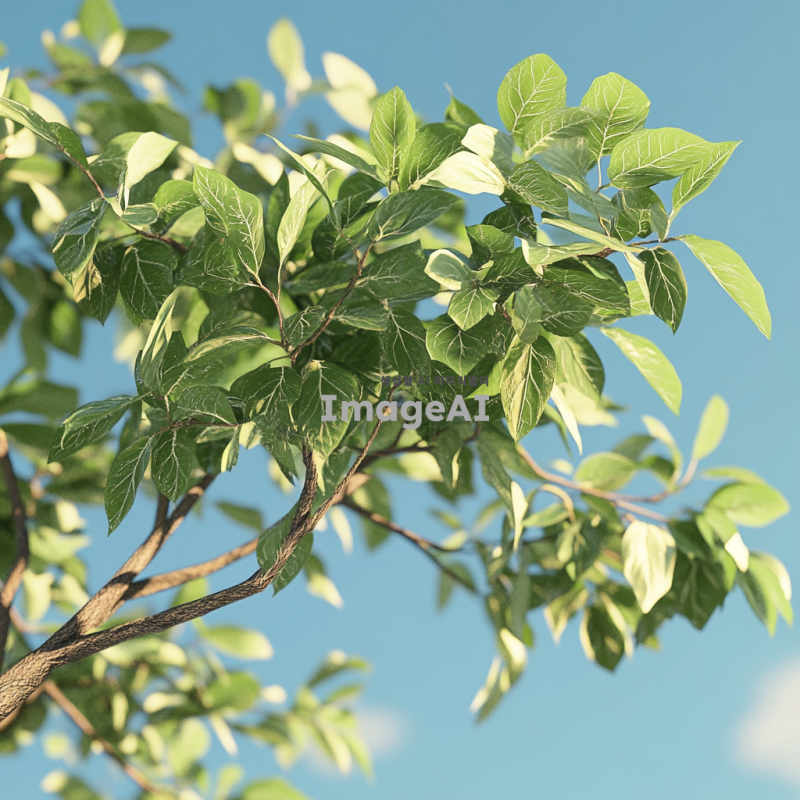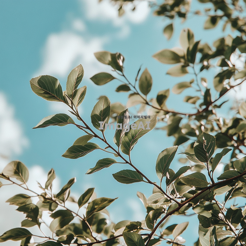푸른 하늘을 배경으로 한 나뭇가지의 클로즈업 이미지, 나뭇잎이 촘촘히 달려 있으며 햇빛이 잎 사이로 부드럽게 비치는 모습, 자연의 생동감과 신선함을 강조, 바람에 살짝 흔들리는 듯한 느낌, 고해상도로 세밀한 질감 표현