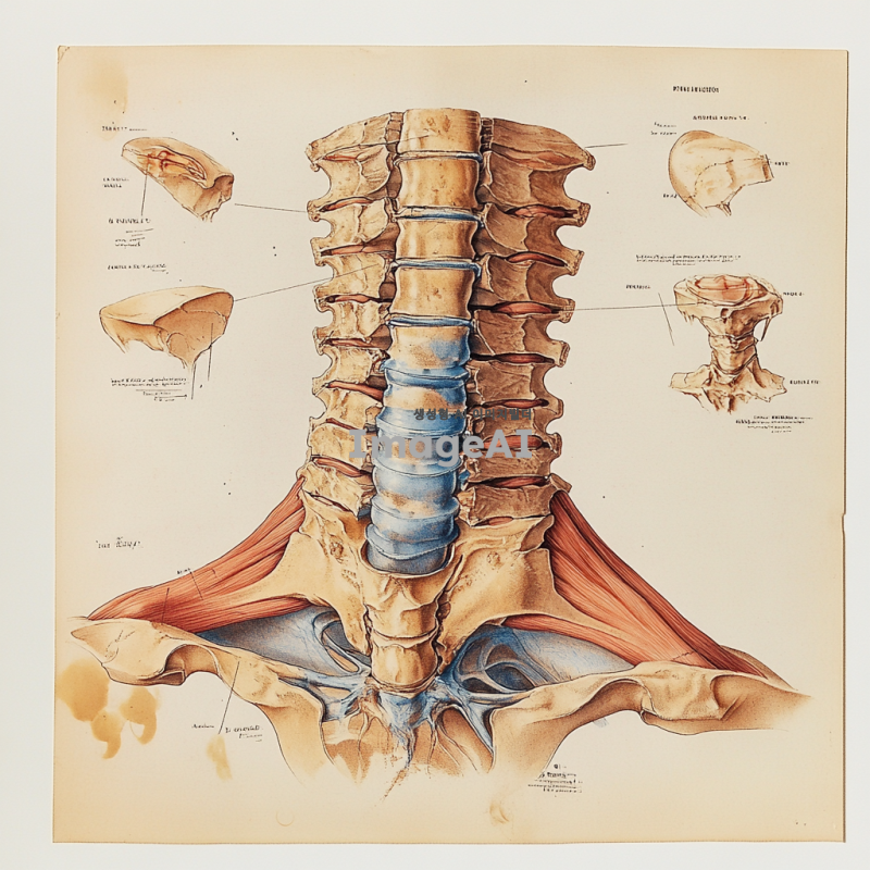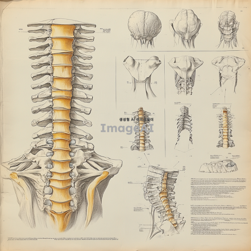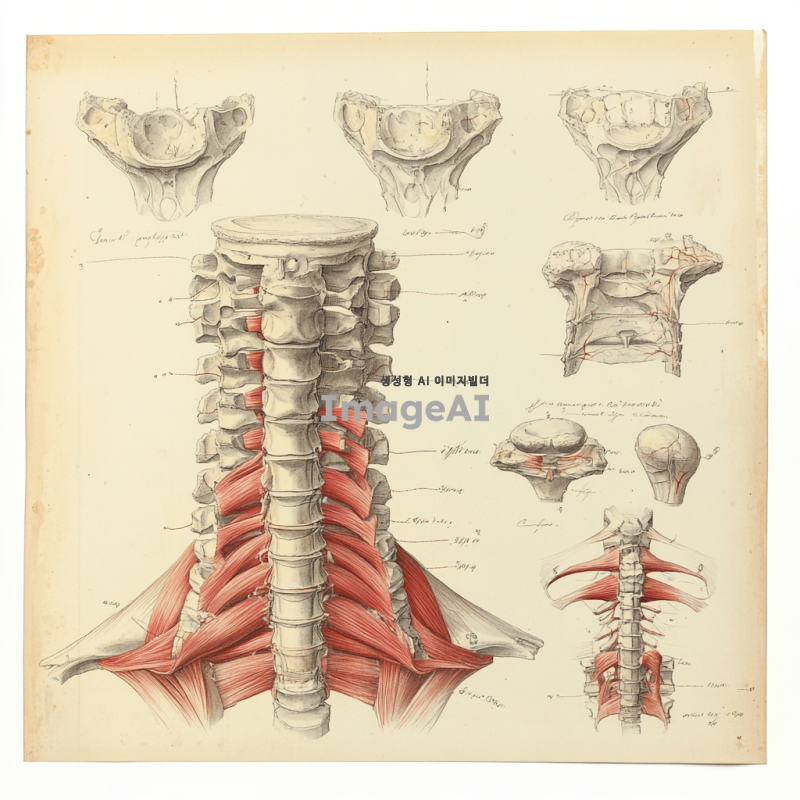 경추디스크의 해부학적 구조를 자세히 묘사한 일러스트레이션, 경추를 구성하는 척추뼈와 디스크의 단면도, 인체의 경추 부분을 강조한 투시도, 디스크 탈출증을 시각적으로 표현, 경추의 움직임과 관련된 근육과 신경의 위치를 포함한 이미지, 의료 교재에 사용될 수 있는 정밀한 해부학적 그림, 경추의 각 부분을 라벨링하여 설명한 교육용 자료, 척추 건강과 관련된 정보를 전달할 수 있는 시각 자료.