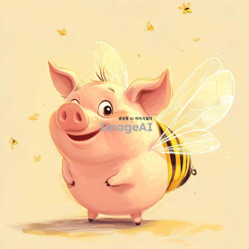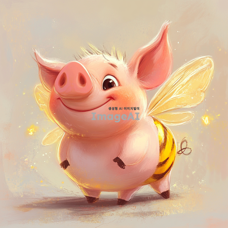 2D 스타일로 그려진 귀엽고 풍자적인 꿀돼지 캐리커쳐, 밝고 유머러스한 분위기, 돼지가 꿀벌의 날개를 달고 있는 모습, 돼지의 얼굴은 웃고 있고 눈은 반짝임, 배경은 단순하고 파스텔 톤, 돼지의 몸은 통통하고 부드러운 곡선으로 표현, 돼지의 피부는 분홍색, 꿀벌의 날개는 투명하고 노란색 줄무늬가 있음.