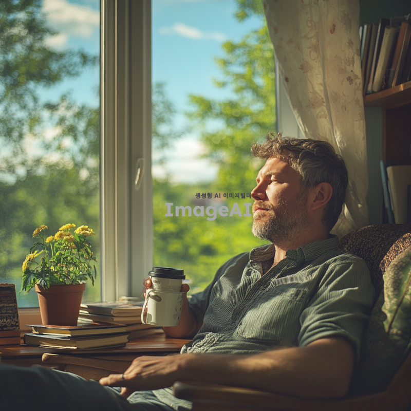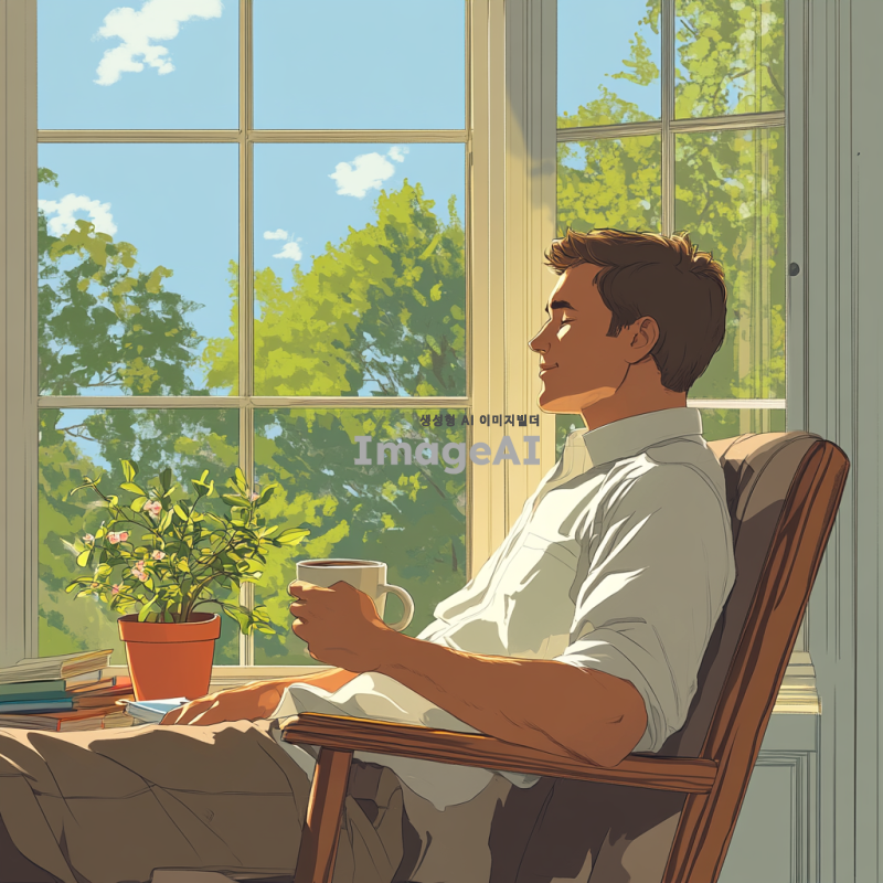 따뜻한 아침 햇살이 비치는 창가에 앉아 있는 남자, 편안한 의자에 기댄 채로 커피잔을 손에 들고 있다. 남자의 표정은 여유롭고 만족스러우며, 그의 주변에는 책과 작은 화분이 놓여 있다. 캐주얼한 셔츠를 입고 있으며, 창밖으로는 초록빛 나무와 푸른 하늘이 보인다. 분위기는 아늑하고 평화롭다.