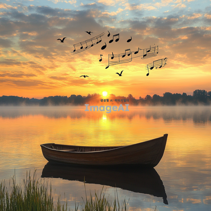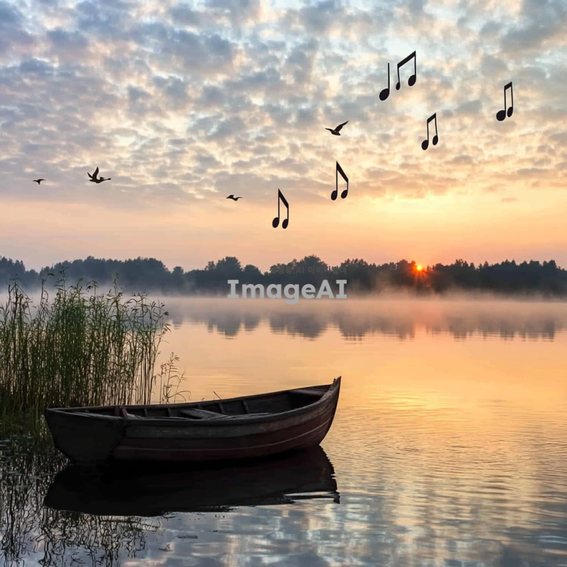 평화로운 자연 풍경, 부드러운 색감의 일출, 잔잔한 호수와 그 위에 떠 있는 작은 나무 배, 새들이 하늘을 날고 있는 모습, 낮은 구름과 함께 어우러진 고요한 아침 분위기, 음악적 요소를 암시하는 음표 모양의 구름.