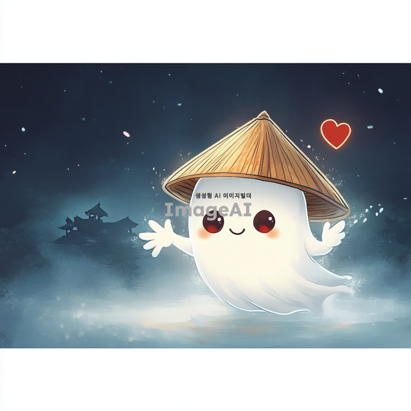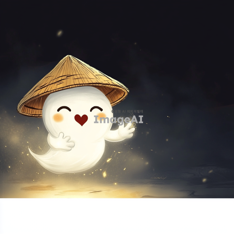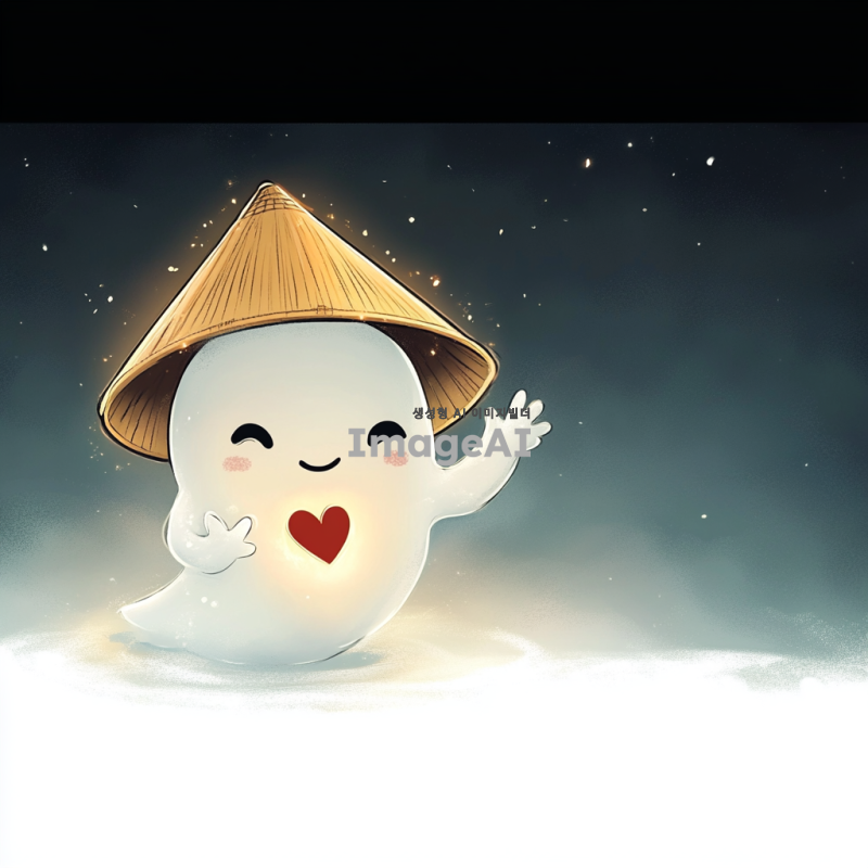 베트남 전통모자인 논라를 쓰고 있는 귀여운 유령, 손가락으로 하트 표시를 하고 있는 모습, 밝고 친근한 분위기, 부드러운 색조와 아기자기한 스타일, 배경은 가벼운 안개가 깔린 밤하늘, 유령의 몸은 반투명하고 은은하게 빛나는 느낌.
