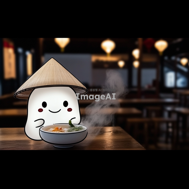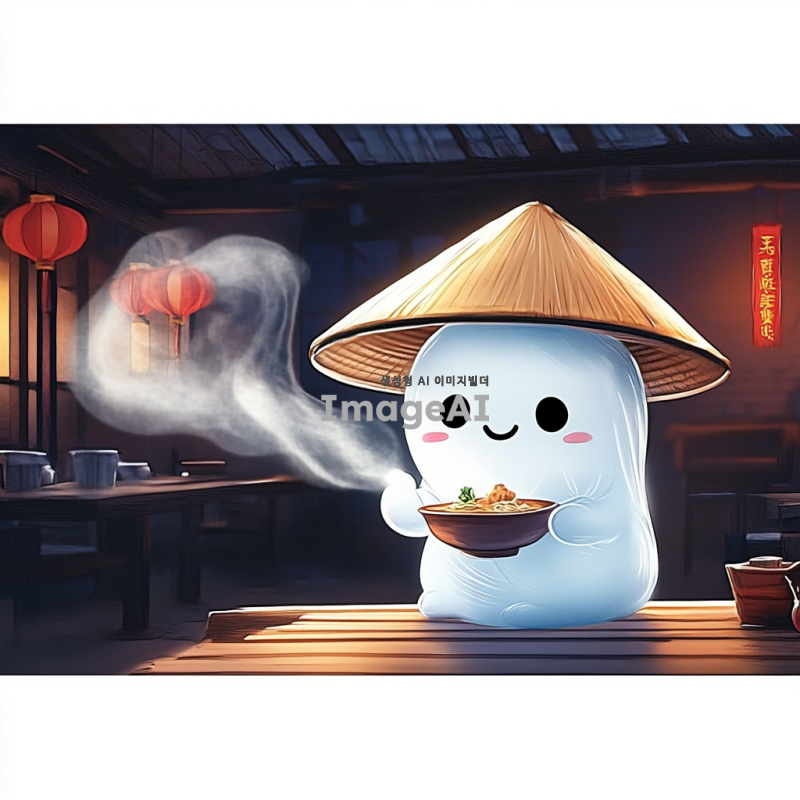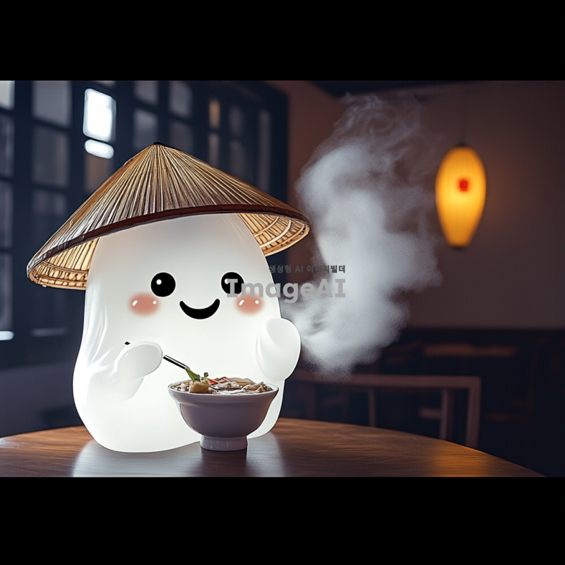 귀여운 유령이 베트남 전통모자인 논 라를 쓰고 앉아 쌀국수를 즐기고 있는 모습. 유령은 투명하고 반짝이는 외형을 가지고 있으며, 주변에는 아늑하고 따뜻한 분위기의 베트남 식당이 배경으로 자리잡고 있다. 쌀국수의 향긋한 김이 피어오르고, 유령의 표정은 행복하고 만족스러운 느낌을 주며, 식당 내부는 전통적인 베트남 장식품들로 꾸며져 있다.