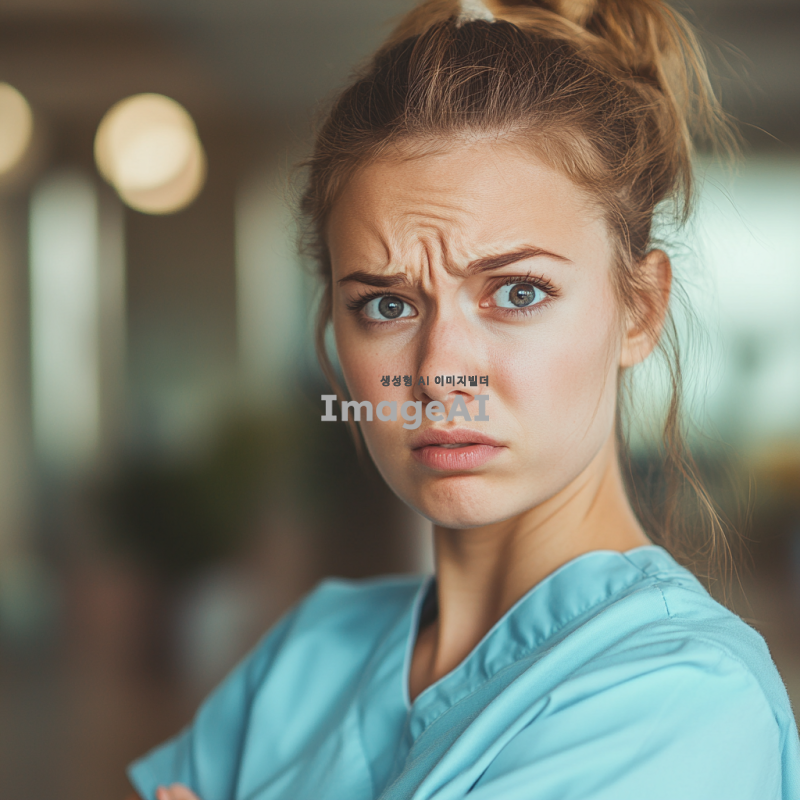 젊은 여성 간호사가 화가 난 표정을 짓고 있는 모습, 긴장된 분위기, 병원 배경.