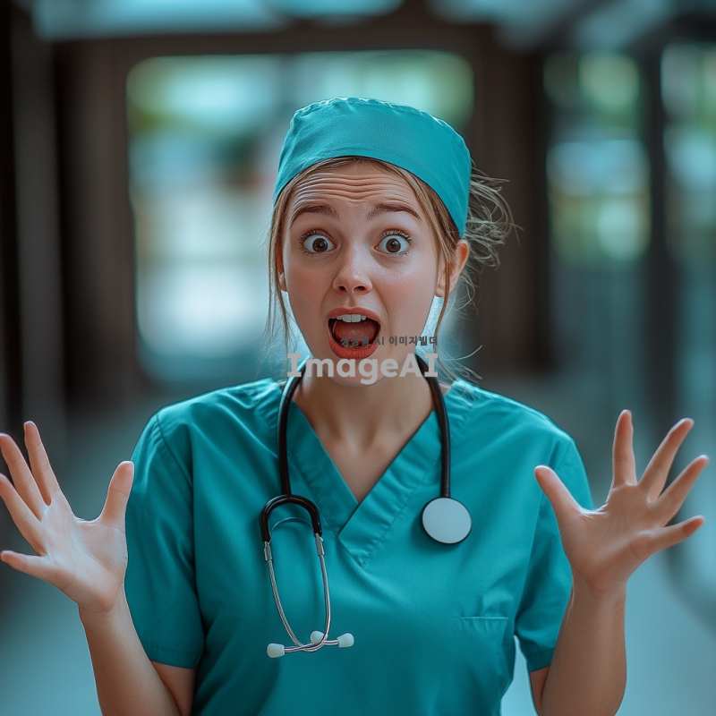 젊은 여성 간호사가 당황한 표정을 짓고 있는 모습, 놀란 분위기, 병원 배경.
