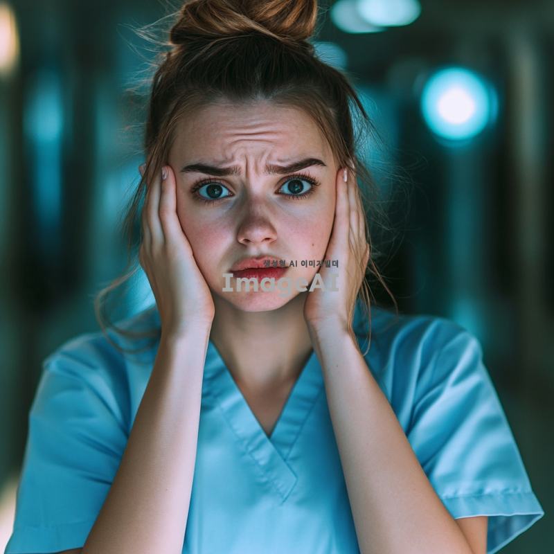 젊은 여성 간호사가 슬퍼하는 표정을 짓고 있는 모습, 감정이 배어 나오는 분위기, 병원 배경.