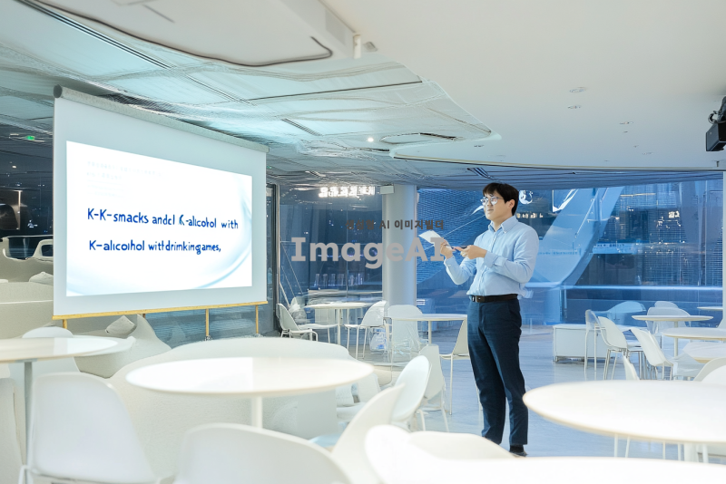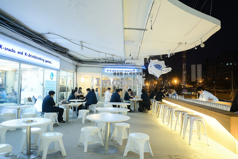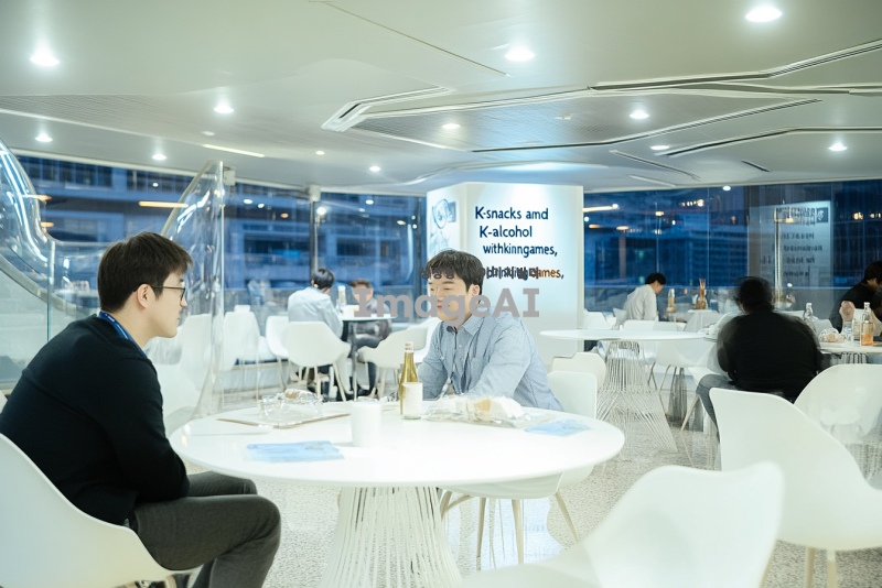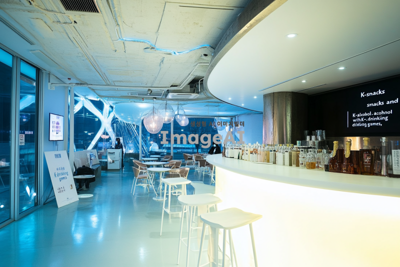 '참조 이미지'의 장소에서 울산에서 개최할 분산에너지에 관한 컨퍼런스의 프로그램 중 하나인 리셉션 세션을 진행할 거야. 리셉션의 주제는 K안주와 K술과 함께하는 K술게임으로 저녁에 이 장소에서 K안주와 울산의 전통주를 마시는, 간단한 술 게임을 진행하는 해외참가자들과 연사들의 모습을 그려줘.