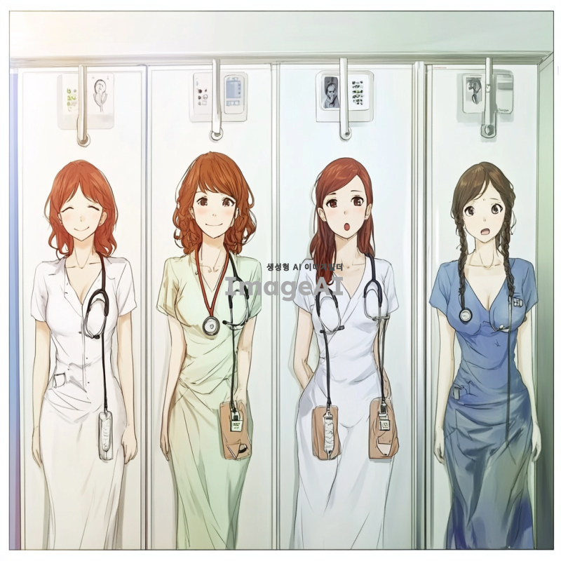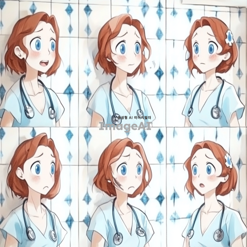 여자 간호사가 다양한 감정을 표현하는 그림 같은 사진, 응급실 배경, 귀여운 그림체, 웃는 모습의 간호사, 우는 모습의 간호사, 화난 모습의 간호사, 당황한 모습의 간호사.