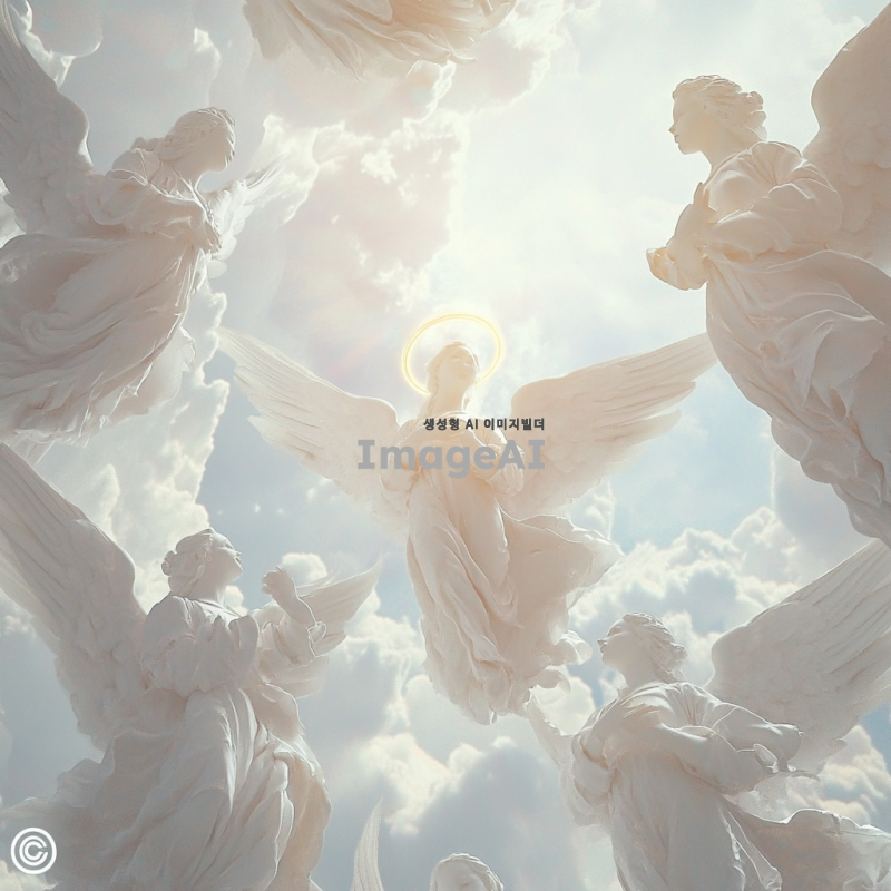 하늘을 배경으로 다양한 천사들이 날아다니는 장면, 각 천사는 하얀색 깃털이 달린 날개를 가지고 있으며, 빛나는 후광이 머리 위에 떠 있는 모습, 천사들의 옷은 고전적인 그리스 로마 스타일의 드레이프가 있는 하얀색 천으로 되어 있고, 하늘은 밝고 맑으며 구름이 부드럽게 흩어져 있는 장면, 천사들은 평화롭고 행복한 표정을 짓고 있으며, 주변에는 부드러운 빛의 효과가 강조된 장면