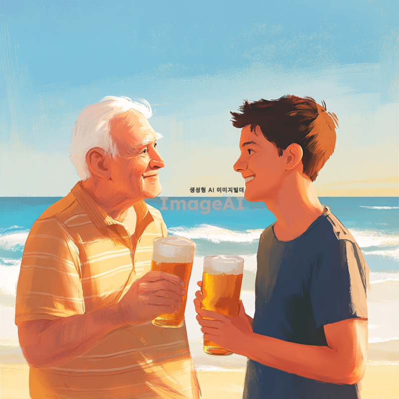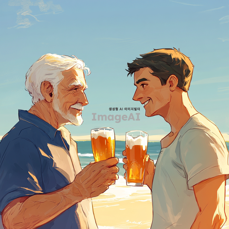 나이든 아빠와 중년의 아들이 바닷가에서 서로 마주보며 맥주를 마시는 모습을 그려줘.