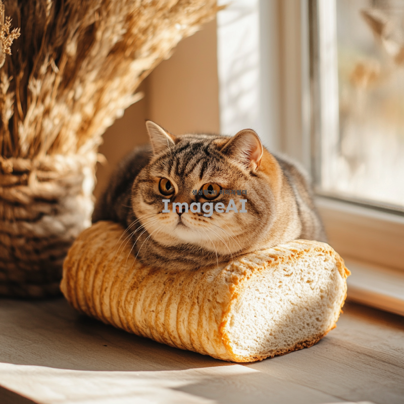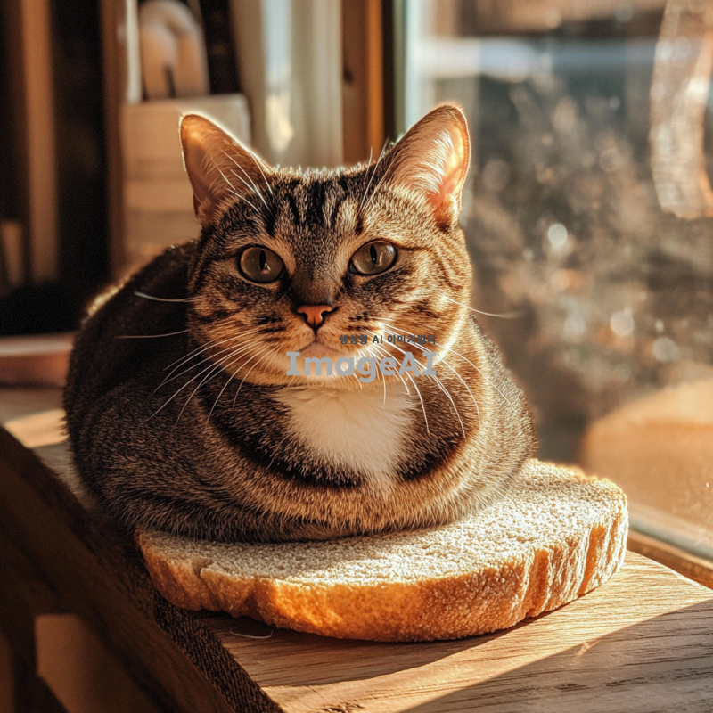 고양이가 식빵 모양으로 앉아 있는 모습, 부드러운 털과 귀여운 얼굴을 강조, 따뜻한 햇살이 비치는 창가에 앉아 있는 장면, 주변에 아늑한 분위기의 실내 인테리어, 고양이의 눈동자가 반짝이는 디테일, 자연스럽고 편안한 자세.