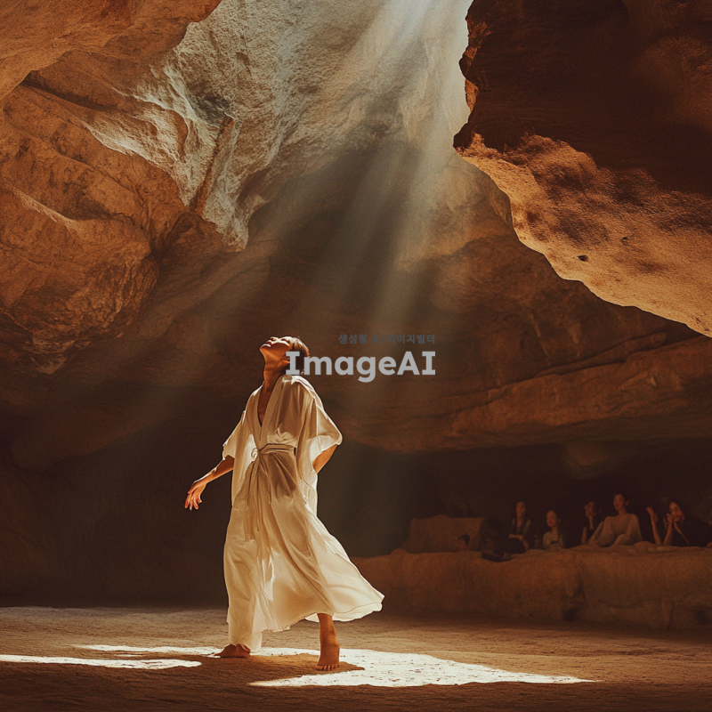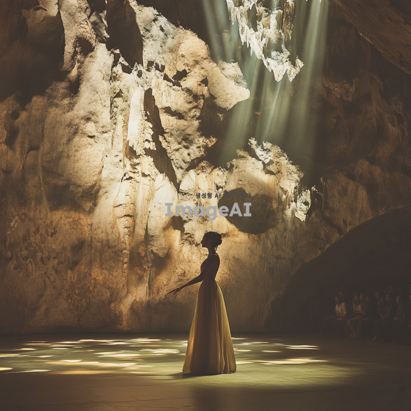 활옥동굴 내부에서 공연 중인 사람, 자연광이 동굴 벽에 부딪혀 부드럽게 퍼지는 모습, 동굴의 독특한 암석 구조와 반사되는 빛, 공연자의 열정적인 표정과 역동적인 자세, 관객들이 감상하는 모습, 신비롭고 몽환적인 분위기, 따뜻한 색조의 조명, 음악의 리듬에 맞춰 흔들리는 그림자들.