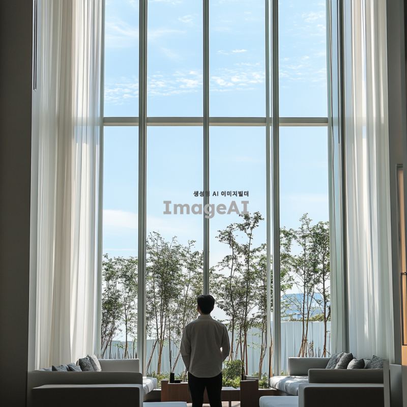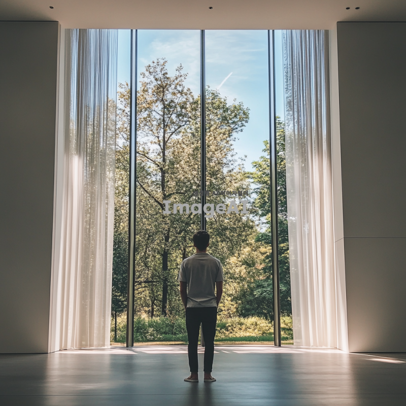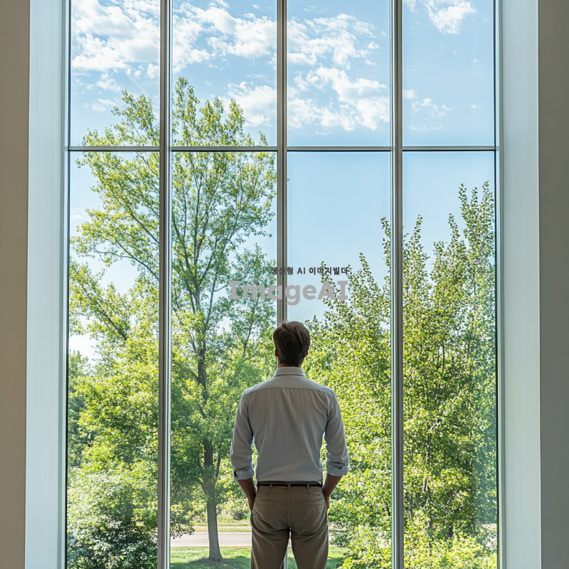 높고 넓은 창문을 통해 밖을 바라보는 남성, 흰색 바탕의 세련된 실내 인테리어, 부드러운 자연 채광, 현대적이고 깔끔한 디자인, 편안한 분위기, 남성은 캐주얼한 옷차림, 실내는 미니멀리즘 스타일, 창밖으로 보이는 푸른 하늘과 나무들.