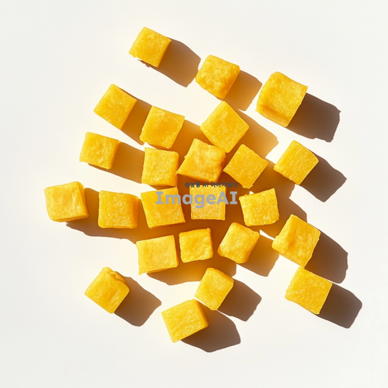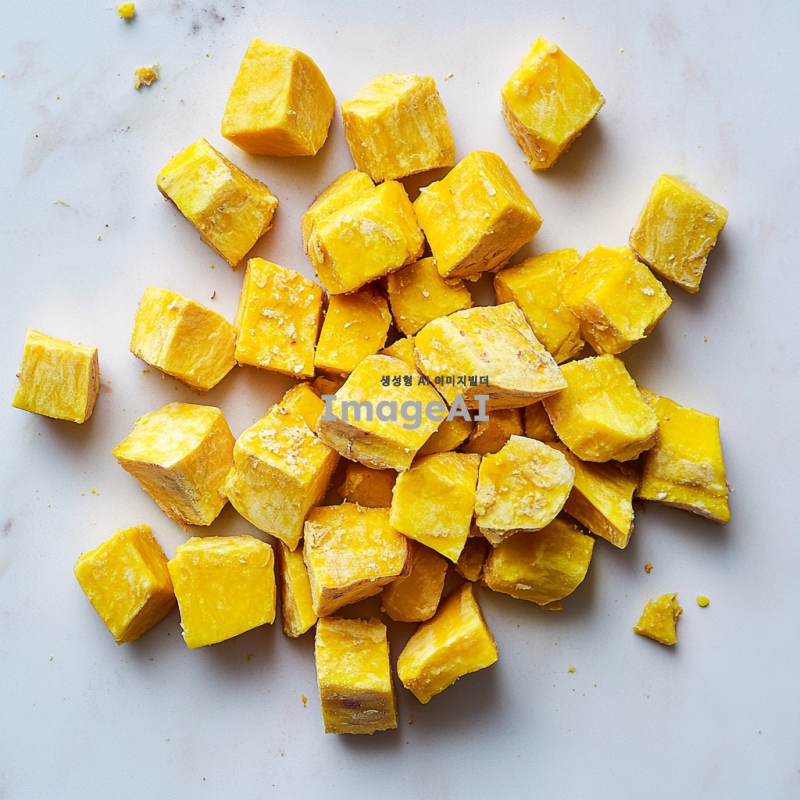 노란 고구마 다이스가 흰 배경에 놓여 있는 밝은 사진