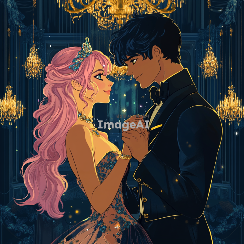일러스트 스타일, 무도회, 화려한 드레스, 흑발 벽안의 황태자, 분홍빛 머리와 노란 눈동자의 공녀, 우아하게 춤추는 장면, 화려한 샹들리에 조명, 고풍스러운 무도회장 배경, 로맨틱하고 환상적인 분위기.