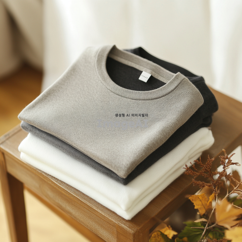 프렌치 시크 스타일의 티셔츠, 가을과 겨울 시즌에 어울리는 톤 다운된 색상 팔레트, 우아하고 절제된 디자인, 부드러운 니트 소재의 질감, 미니멀한 패턴과 세련된 실루엣, 프랑스 파리의 거리에서 영감을 받은 세련된 분위기, 클래식한 요소와 현대적인 감각의 조화, 가을 낙엽과 겨울 눈송이를 연상시키는 자연 모티프, 고급스러운 디테일과 섬세한 마무리.