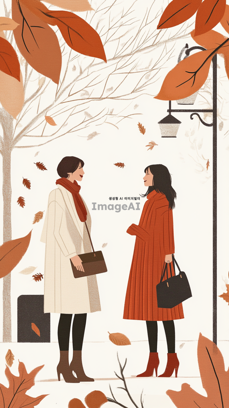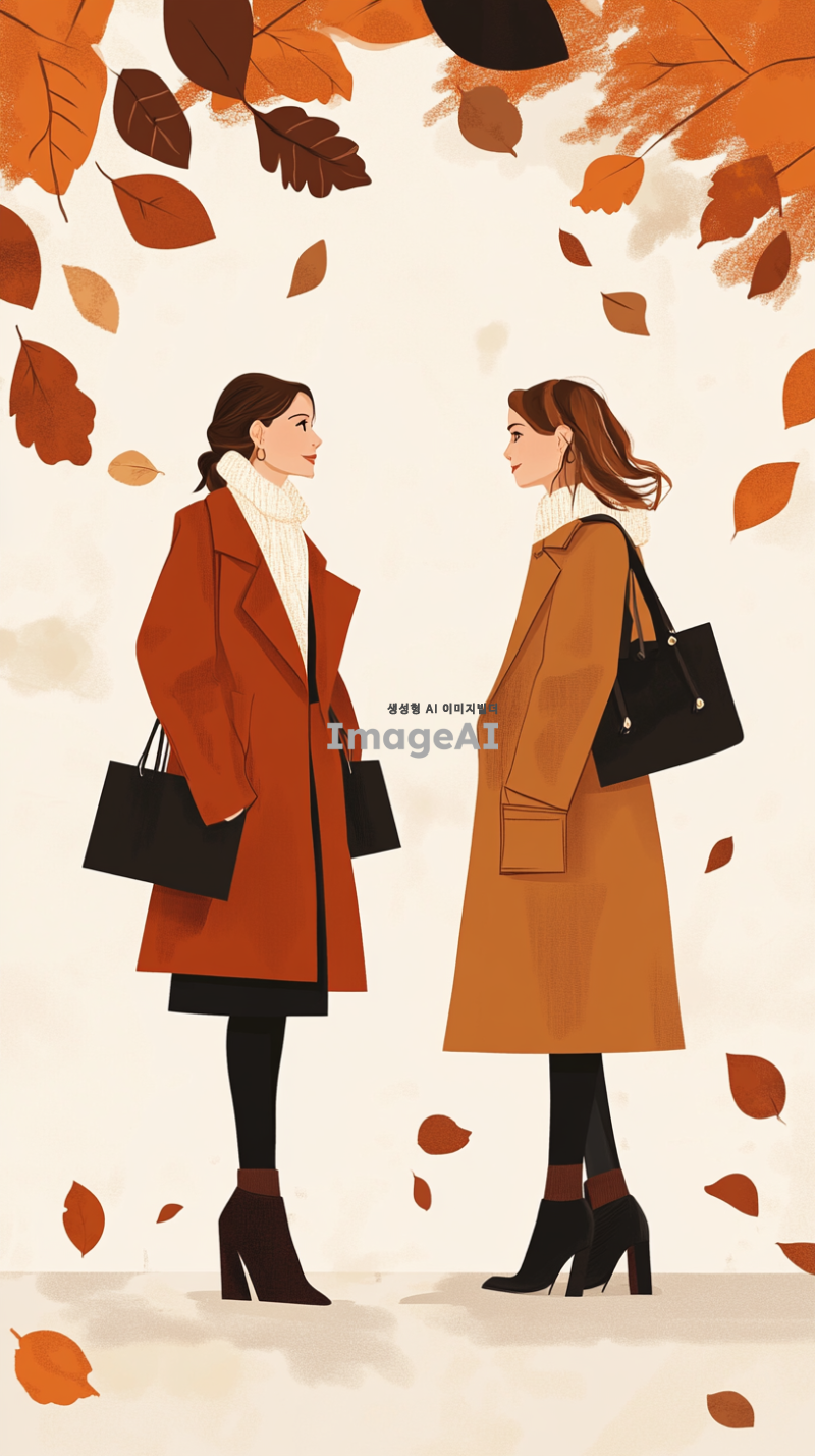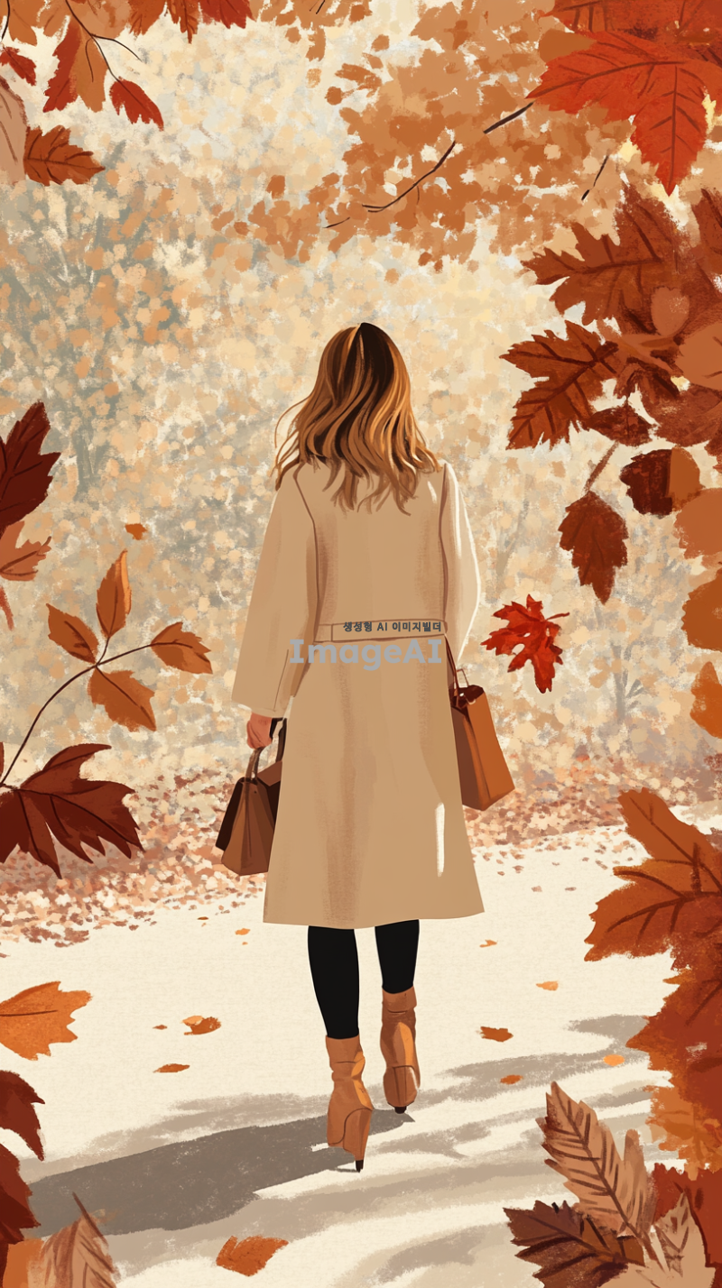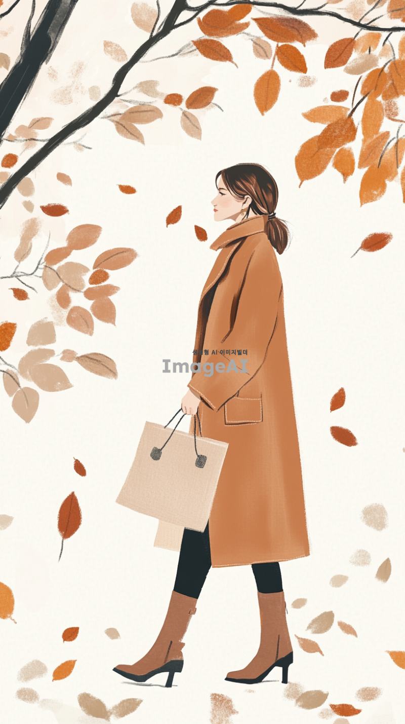 프랑스 브랜드 Sandro의 가을 겨울 시즌에 어울리는 일러스트, 파리의 세련된 거리에서 영감을 받은 현대적이고 우아한 스타일, 따뜻한 색조의 패션 아이템과 함께 부드러운 니트웨어와 클래식한 코트, 스타일리시한 부츠와 가방을 매치한 모습, 낙엽이 떨어지는 로맨틱한 배경, 고급스러우면서도 편안한 분위기, 세련된 프랑스 패션의 정수를 표현한 장면.