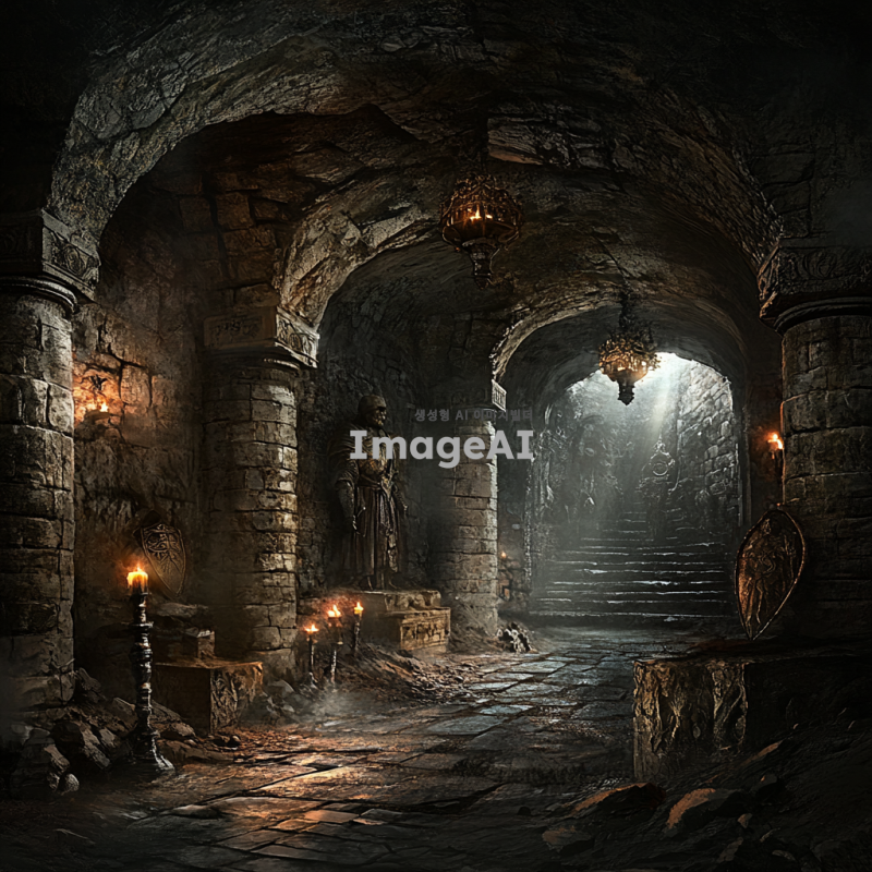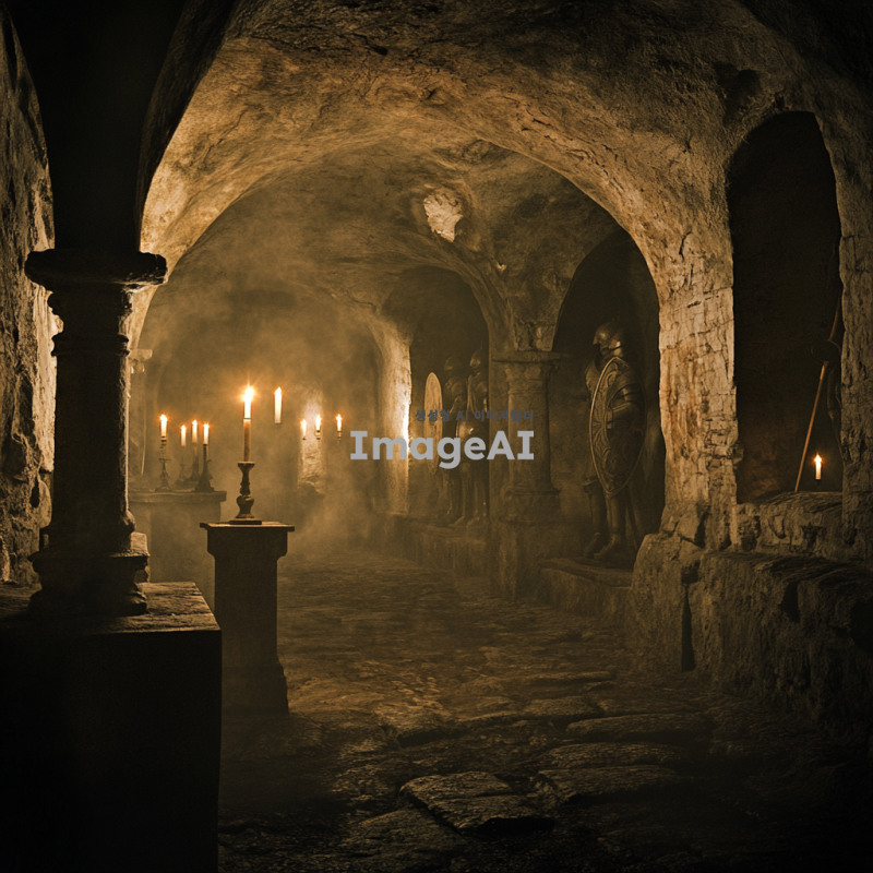어두운 지하무덤, 오래된 석조 벽과 천장, 고대의 문양이 새겨진 돌판, 희미한 빛이 비치는 작은 틈, 곳곳에 놓인 오래된 촛대와 촛불, 먼지가 쌓인 고대의 무기와 방패, 신비로운 분위기의 안개가 깔린 바닥, 중세 시대의 갑옷을 입은 영웅의 조각상, 고요하지만 긴장감이 감도는 분위기, 미스터리한 느낌의 고대 유물들이 흩어져 있는 공간.