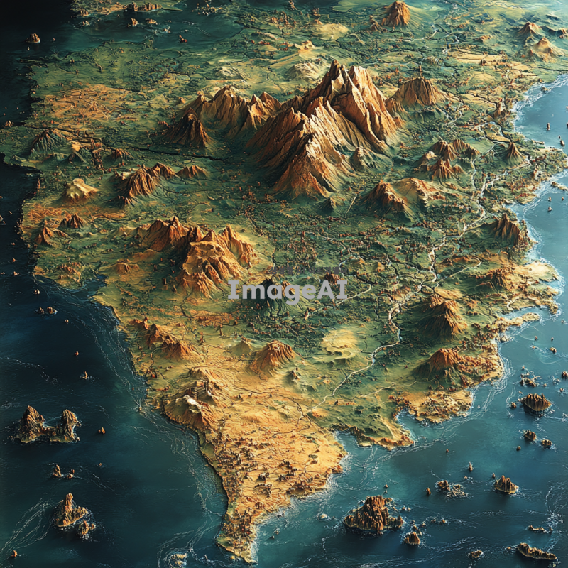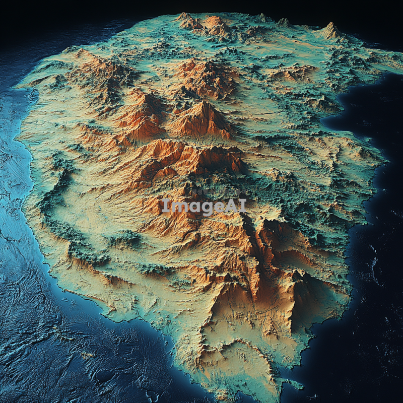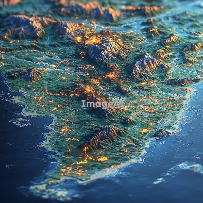 검은 배경 위에 한반도의 지형을 세밀하게 표현하고, 산맥과 강이 부드럽게 드러나도록 하며, 자연스러운 색감과 명암을 사용하여 현실감을 더한다.
