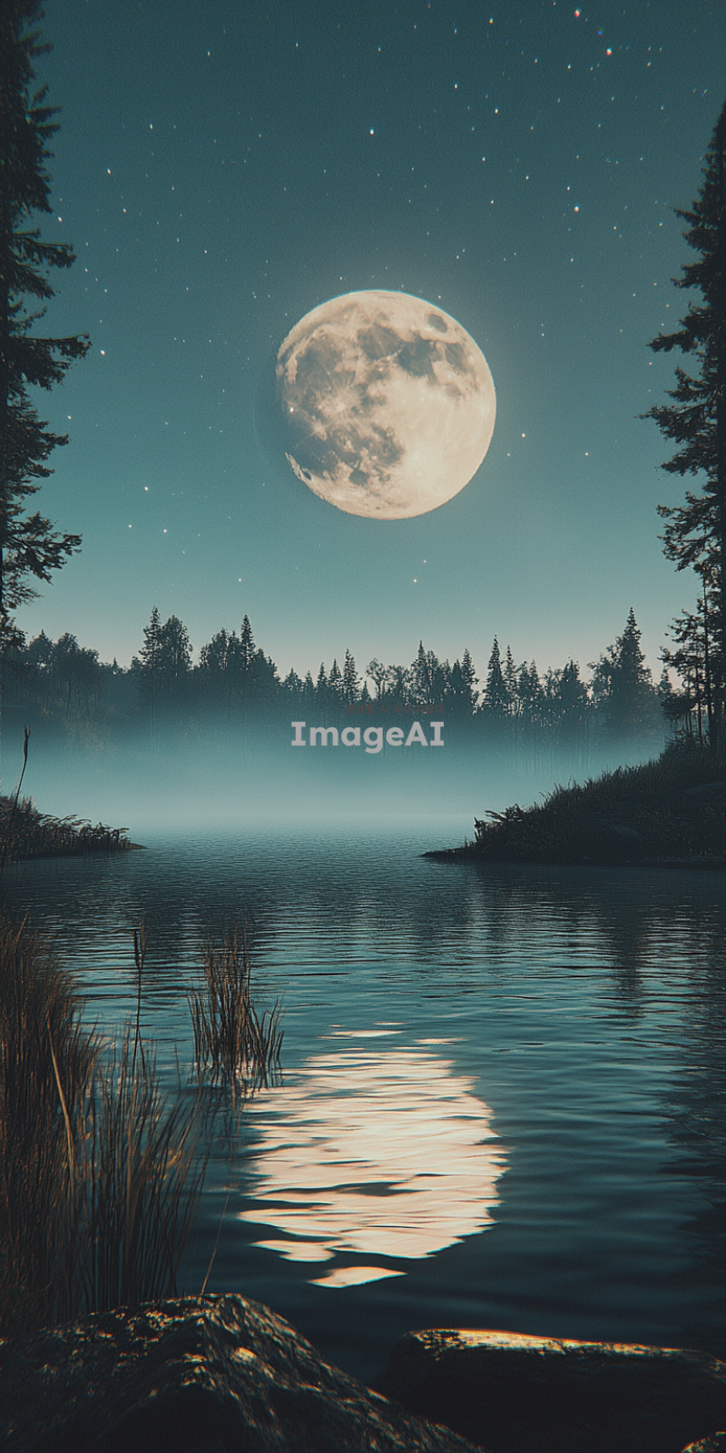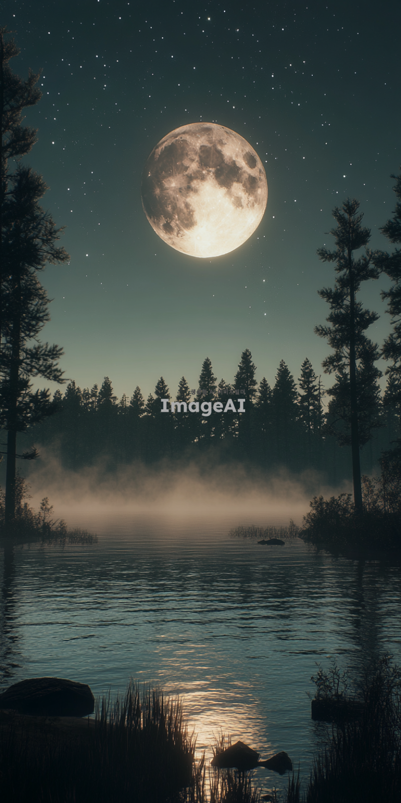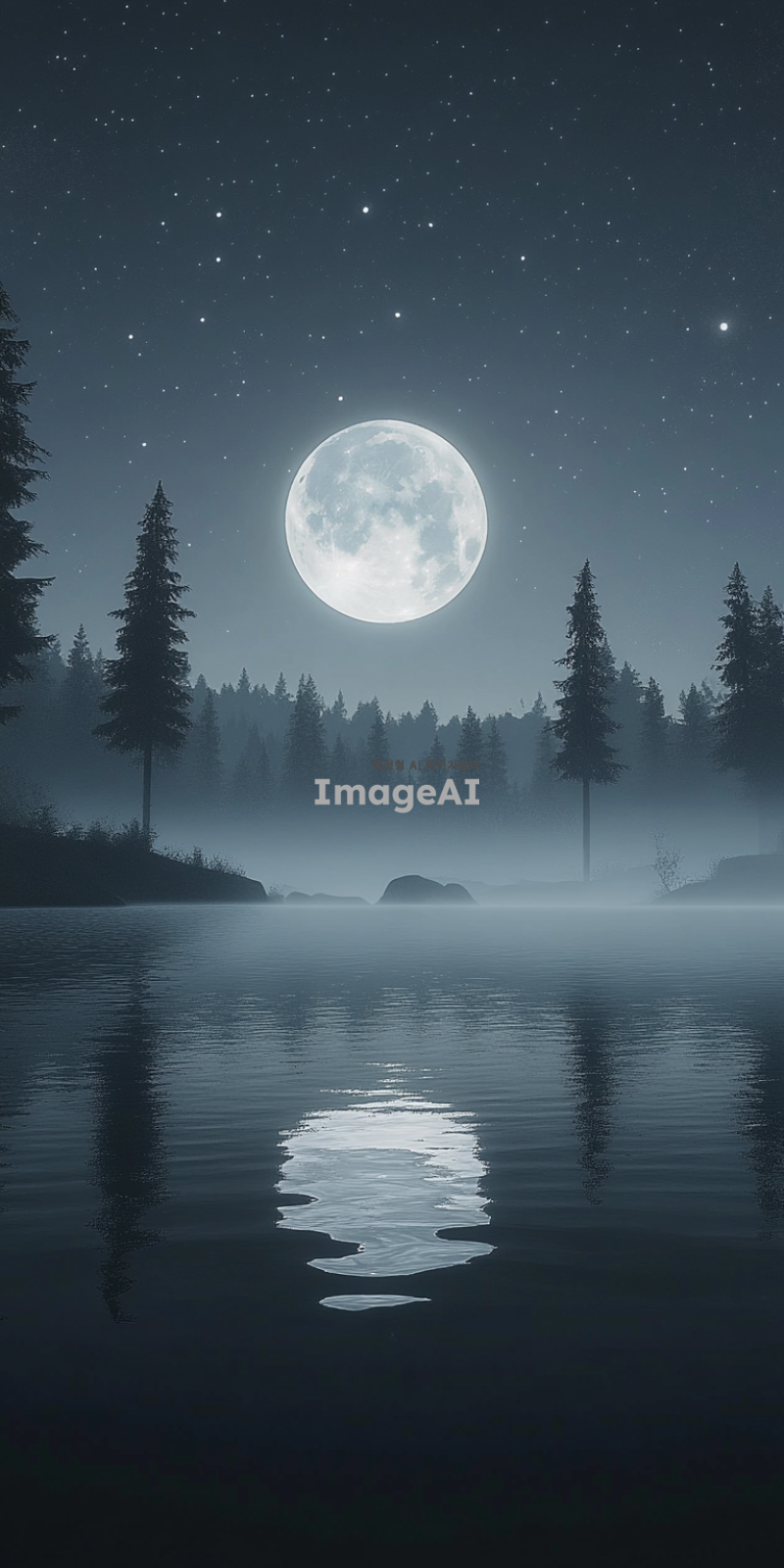 고요한 호수 위에 밝게 빛나는 보름달, 주변에는 은은한 안개가 드리워져 신비로운 분위기, 호수에 반사된 달빛이 물결에 따라 부드럽게 흔들리는 모습, 주변에는 키 큰 소나무들이 그림자처럼 서 있는 장면, 맑고 별이 가득한 밤하늘, 차분하고 평화로운 느낌.