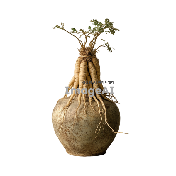 고풍스러운 한국 전통 도자기에 담긴 신선한 인삼 뿌리, 자연광 아래에서 섬세하게 묘사된 인삼의 질감과 디테일, 배경은 은은한 한지 느낌의 텍스처, 조화로운 색감으로 건강과 자연의 아름다움을 강조