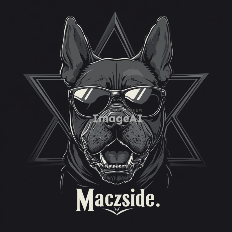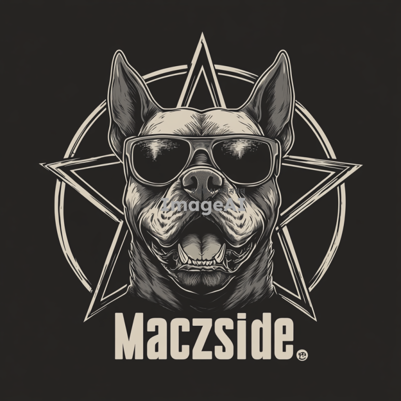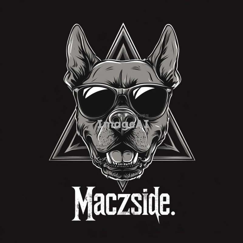 - 선글라스를 쓴 화난 핏불 해골을 특징으로 하는 로고로 배경에는 검은색 배경에 오망성이 있음. 강한 선과 날카로운 디테일을 통해 힘을 전달해야 하며, "Maczside"라는 메탈 록 밴드를 위한 디자인. 은색만 사용하며 벡터 스타일로 표현.