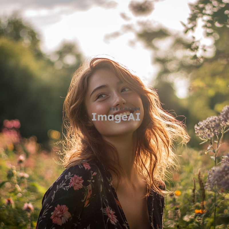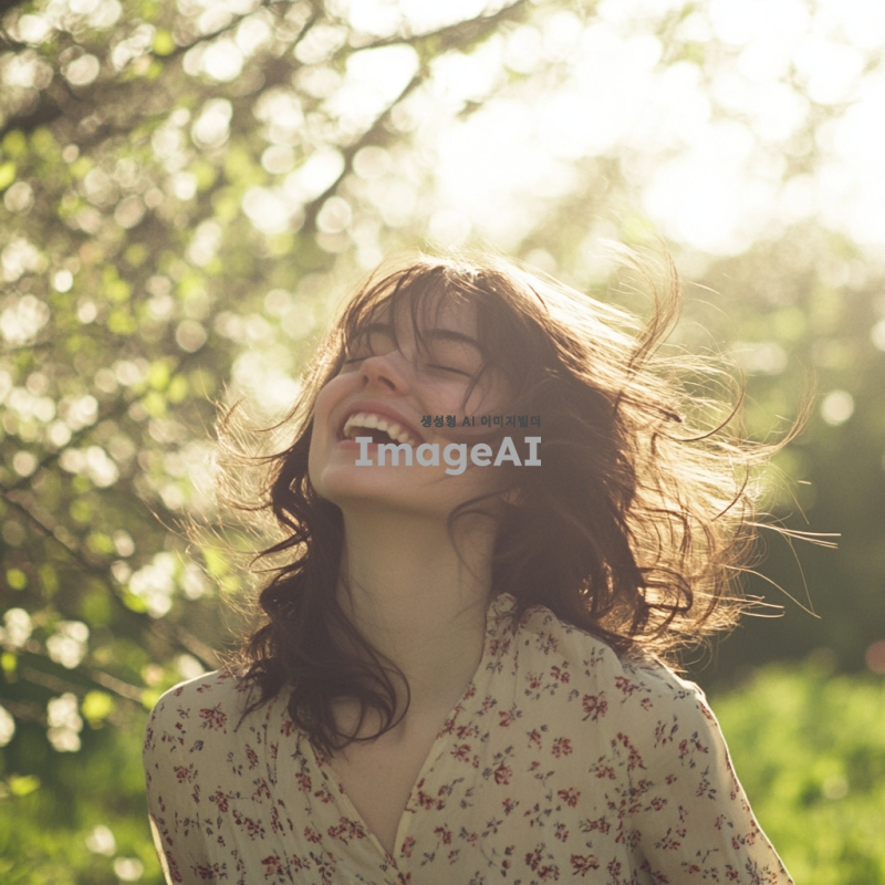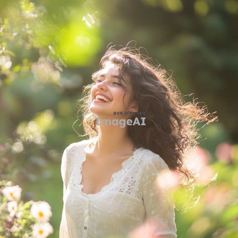 밝고 따뜻한 분위기의 공원에서 웃고 있는 젊은 여성, 머리카락이 바람에 살짝 날리고 있으며, 캐주얼한 옷차림, 자연스러운 포즈, 주변에 꽃과 나무들이 어우러진 장면, 부드러운 햇살이 비치는 오후 시간, 행복하고 편안한 느낌.