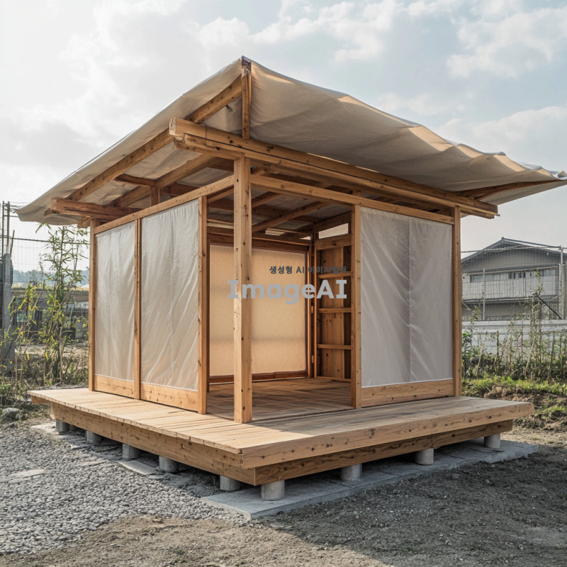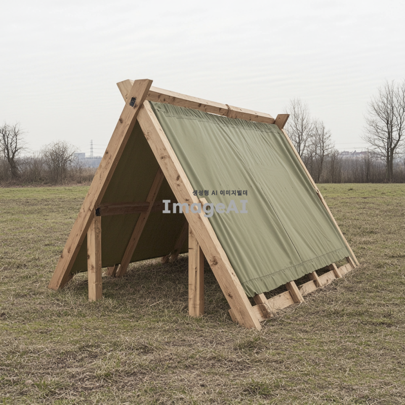 간단한 조립식 휴대용 대피소, 막사 또는 텐트 형태, 사용자가 크기 조절 가능, 비닐이나 천 재질로 비와 바람 차단, 동일한 길이의 두 개 나무로 천장 구성, 짧은 나무들로 기둥 세워 기본 구조 형성, 스태킹 방식으로 제작, 사용자가 쉽게 이해하고 구현할 수 있는 디자인, 자연 친화적인 색상과 질감, 실용적이고 효율적인 구조.