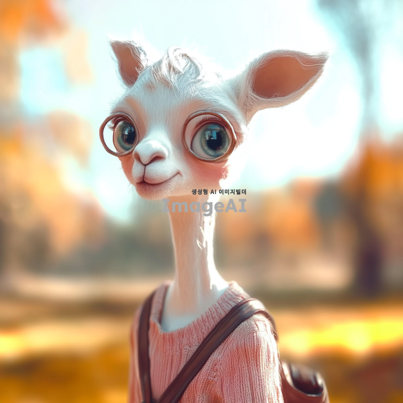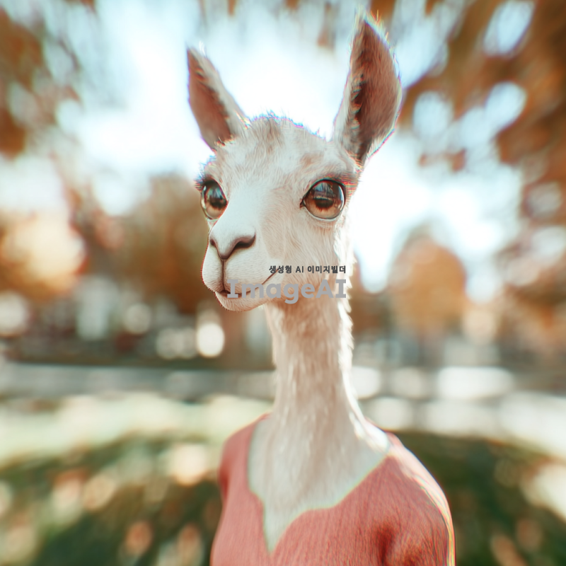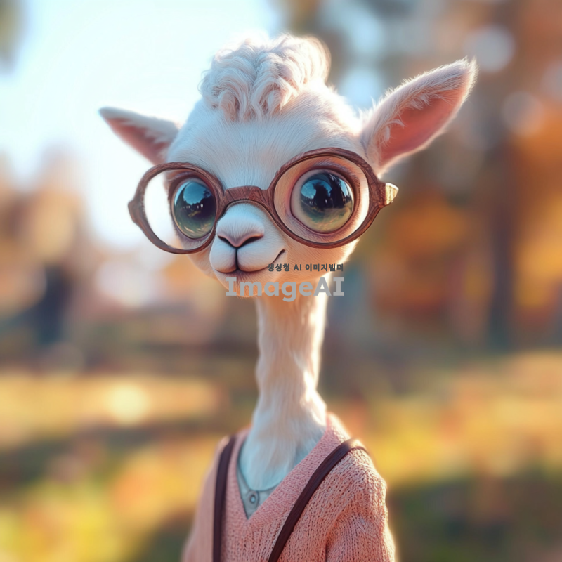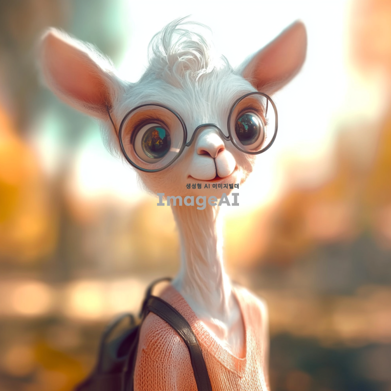 흰색 라마의 얼굴을 가진 캐릭터, 사람의 몸을 하고 있으며 부드러운 털과 큰 눈을 갖고 있음. 캐릭터는 캐주얼한 옷차림을 하고 있으며, 밝고 친근한 표정을 짓고 있음. 배경은 자연 속에서 평화로운 분위기를 연출하고 있으며, 햇빛이 따뜻하게 비치는 모습.