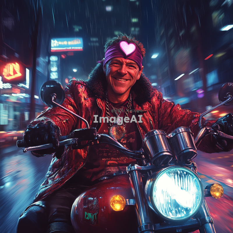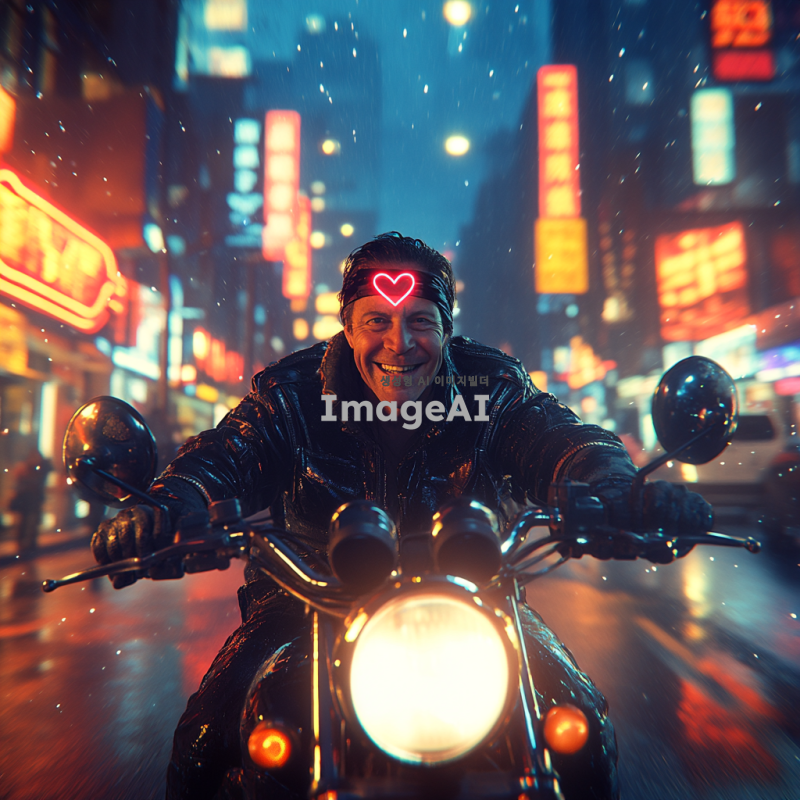 술에 취한 중년 남성이 하트 모양의 머리띠를 하고 오토바이를 타고 있는 장면, 밤하늘 아래 도시의 거리 배경, 오토바이의 불빛이 반짝이는 모습, 남성의 얼굴은 웃고 있으며 약간 붉어진 볼을 가진 모습, 주변에는 흐릿한 도시의 불빛과 네온사인이 함께 어우러진 분위기.
