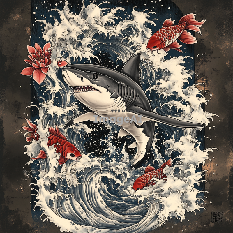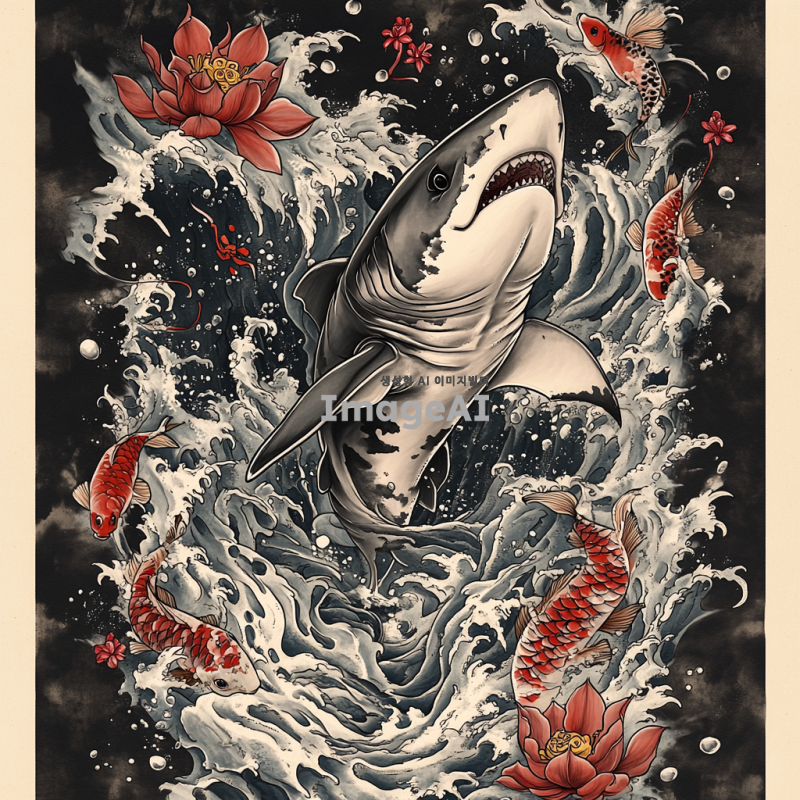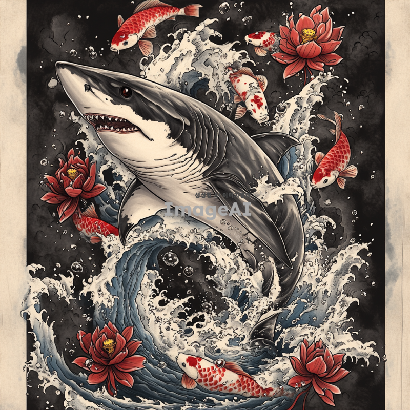 전통적인 일본 이레즈미 스타일로 그려진 상어 문신, 물결과 함께 역동적으로 움직이는 상어, 세밀한 비늘과 강렬한 눈빛, 주변에 잉어와 연꽃이 조화를 이루며, 깊은 바다의 느낌을 주는 어두운 배경, 강렬한 색채와 대비를 통해 생동감을 강조한 디자인.