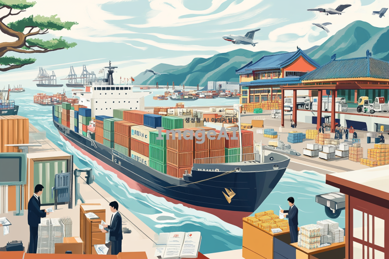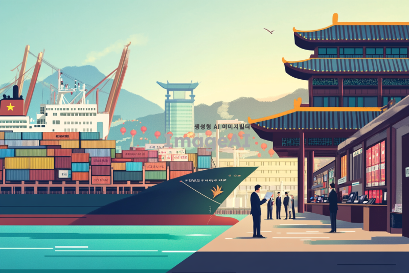 중국과 한국 간의 무역을 상징하는 이미지, 다양한 상품들이 컨테이너에 실려 항구에 정박한 대형 화물선, 중국과 한국의 전통적인 건축물이 배경에 조화롭게 어우러진 장면, 현대적인 무역의 활발함을 나타내는 비즈니스맨들이 서류를 검토하고 있는 모습, 전자기기, 패션, 생활용품 등 다양한 제품들이 선반에 진열된 모습, 글로벌 시장을 배경으로 한 중국과 한국의 협력적인 무역 관계를 시각적으로 표현하는 이미지.