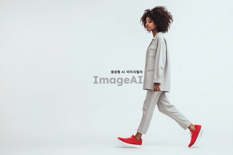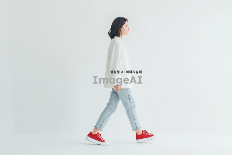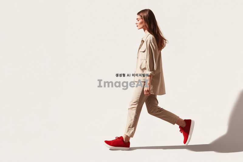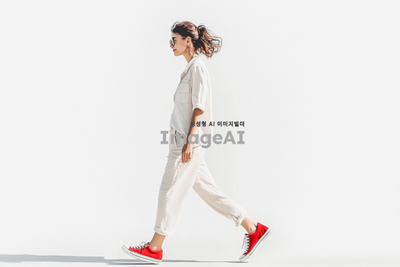 흰 배경 위에서 산책하는 여성을 묘사, 그녀는 편안한 복장에 빨간 운동화를 신고 있으며, 자연스럽고 여유로운 분위기.