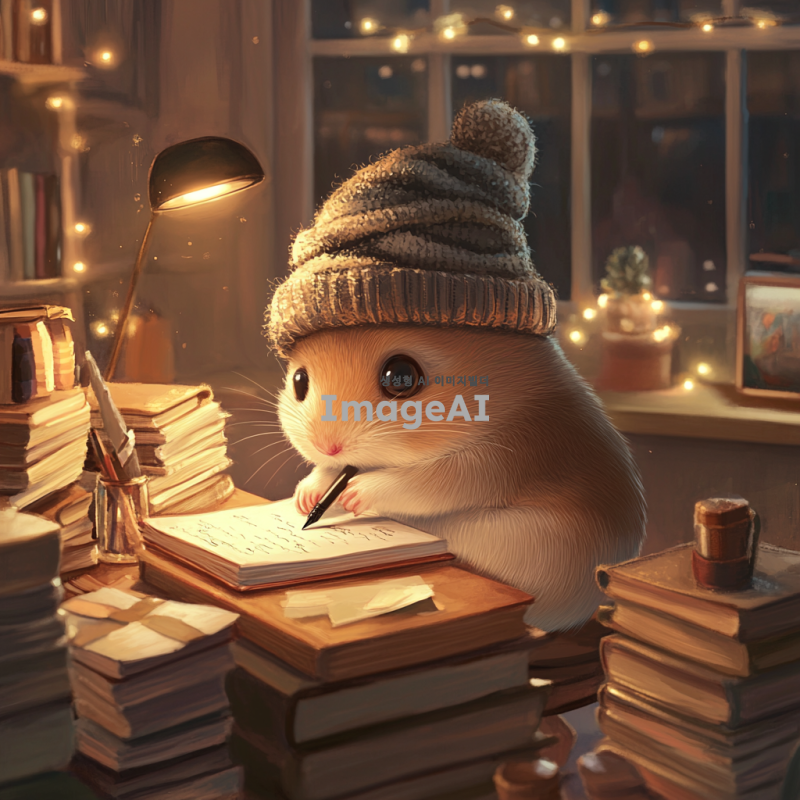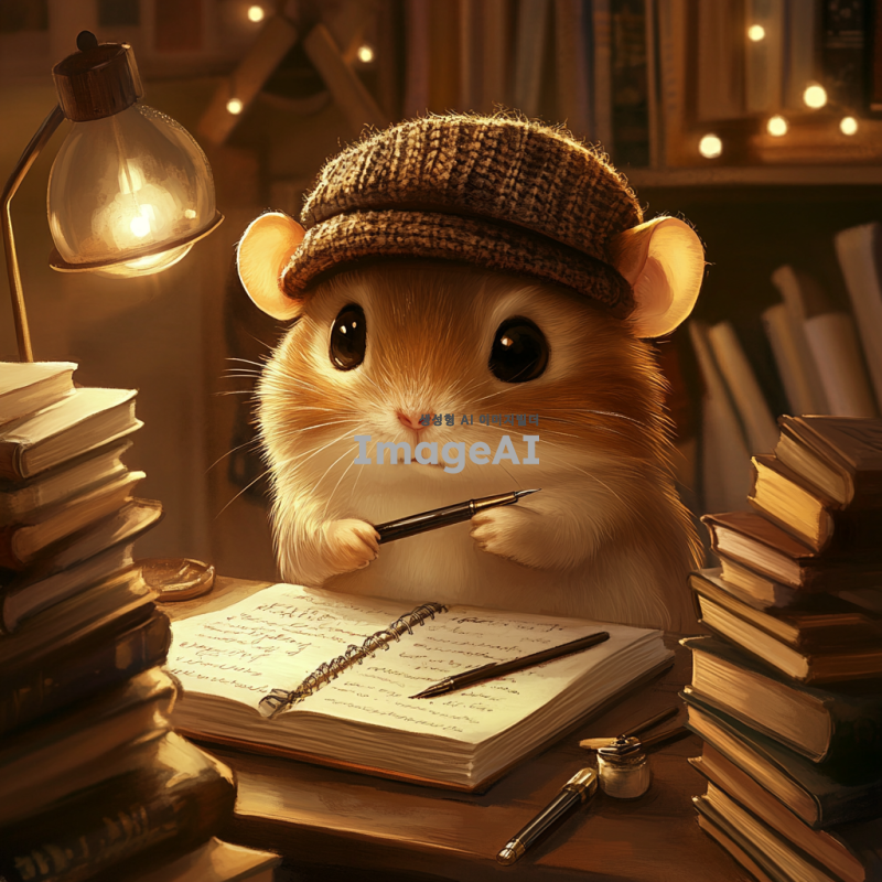 작가의 모자를 쓴 귀여운 햄스터, 작은 책상에 앉아 펜을 들고 글을 쓰고 있는 모습, 주변에는 책과 종이가 가득 쌓여 있으며, 따뜻한 조명이 비추는 아늑한 방, 햄스터의 눈은 반짝이며 창의적인 아이디어가 넘치는 표정, 부드럽고 따뜻한 색감의 일러스트 스타일