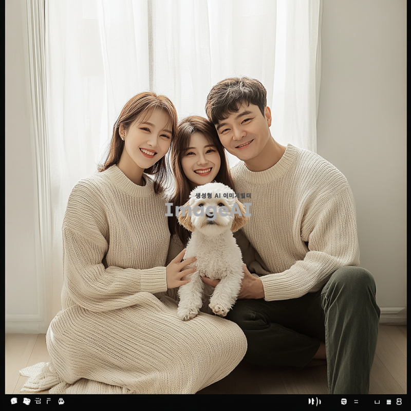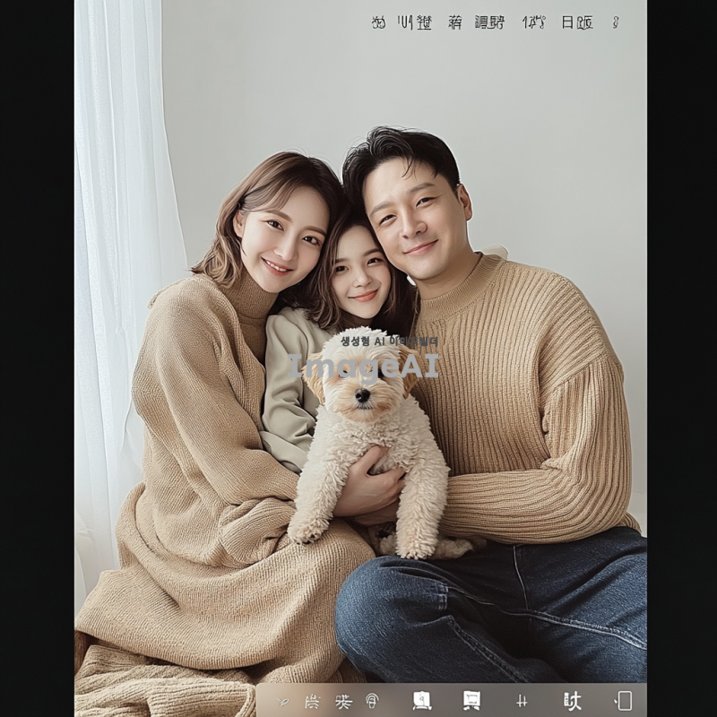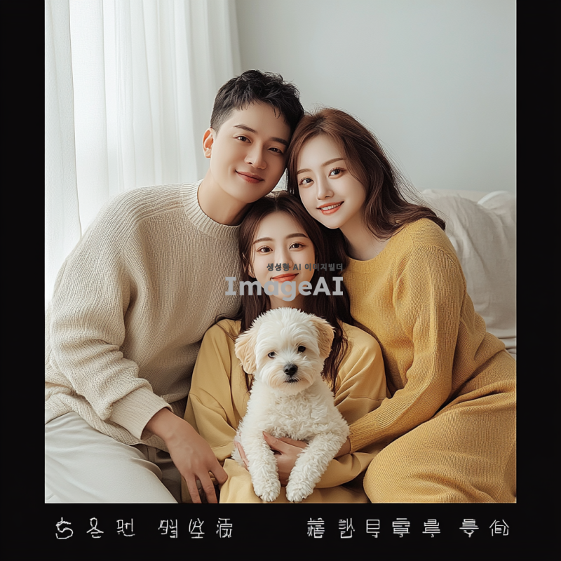 따뜻한 가족사진, 밝은 분위기, 실내 배경, 말티푸 강아지와 함께 있는 모습, 엄마 154cm, 아빠 175cm, 나 155cm, 엄마 6등신, 아빠 7등신, 나 6등신, 캐주얼한 옷차림, 웃고 있는 얼굴, 자연스러운 포즈, 가족애가 느껴지는 장면, 강아지는 가족 앞에 앉아있는 모습, 부드러운 조명, 아늑한 가정의 느낌.