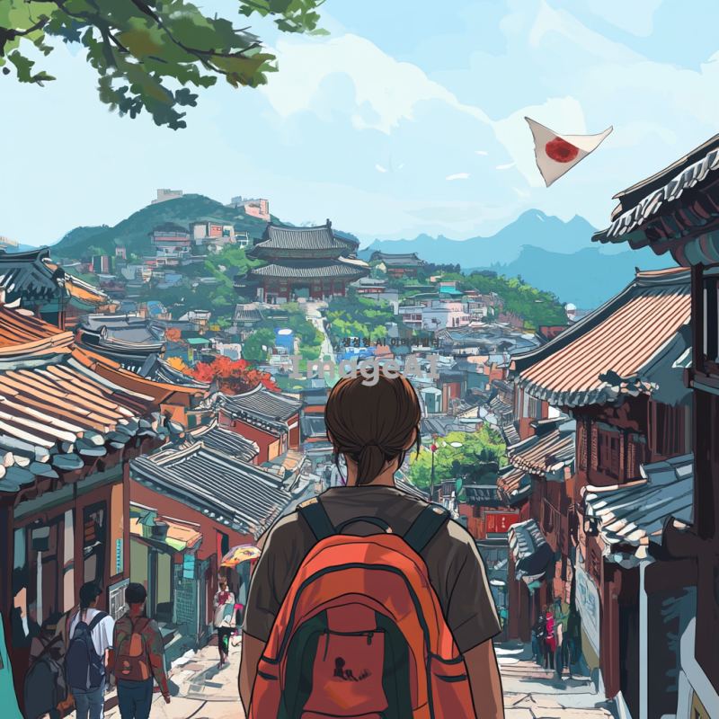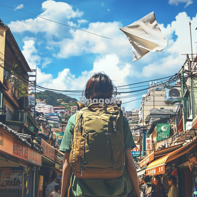 배낭을 메고 태극기가 휘날리는 장면, 푸른 하늘 아래 다양한 문화가 어우러진 도시 풍경, 여행자의 뒷모습이 태극기와 함께 조화를 이루는 모습, 자유롭고 활기찬 분위기, 다양한 사람들이 어우러진 거리, 여행자의 발걸음이 닿는 곳마다 새로운 경험이 가득한 느낌, 태극기가 바람에 휘날리며 여행의 열정을 상징하는 이미지.