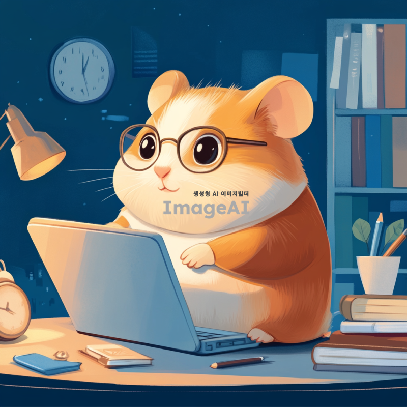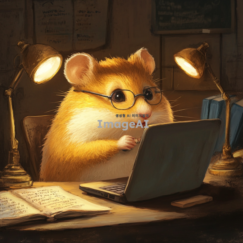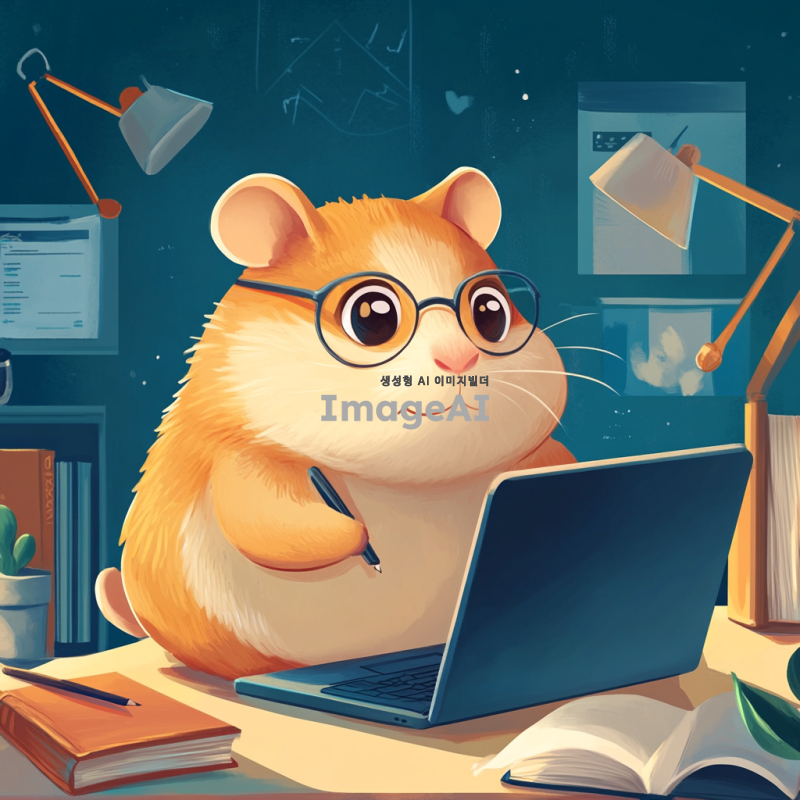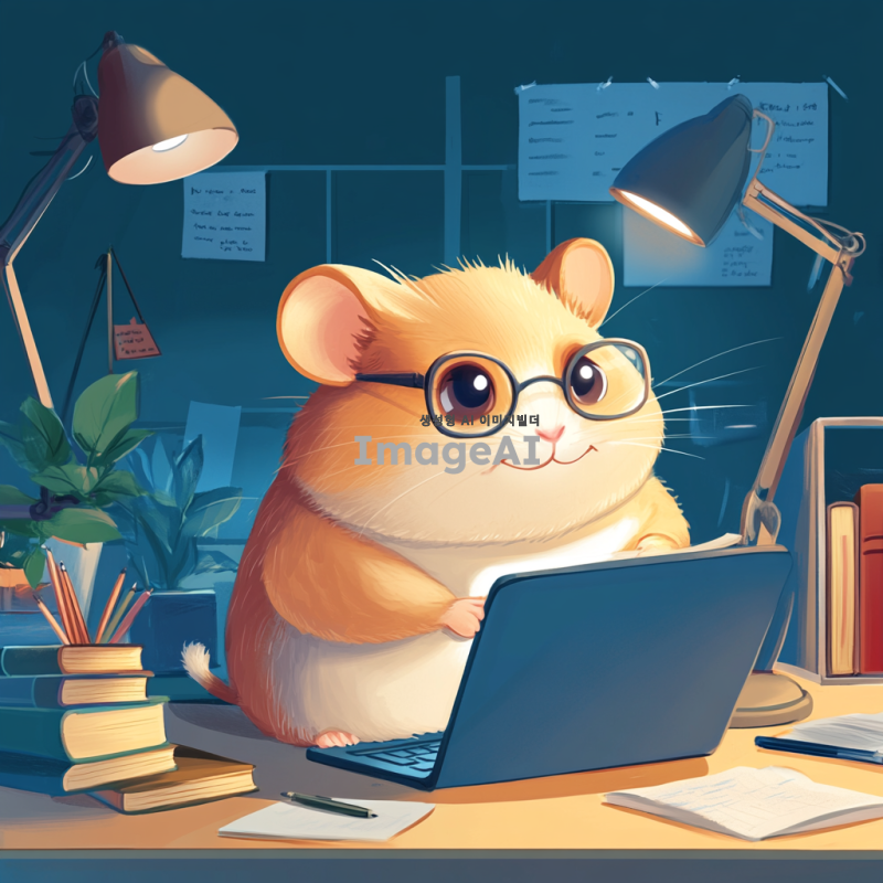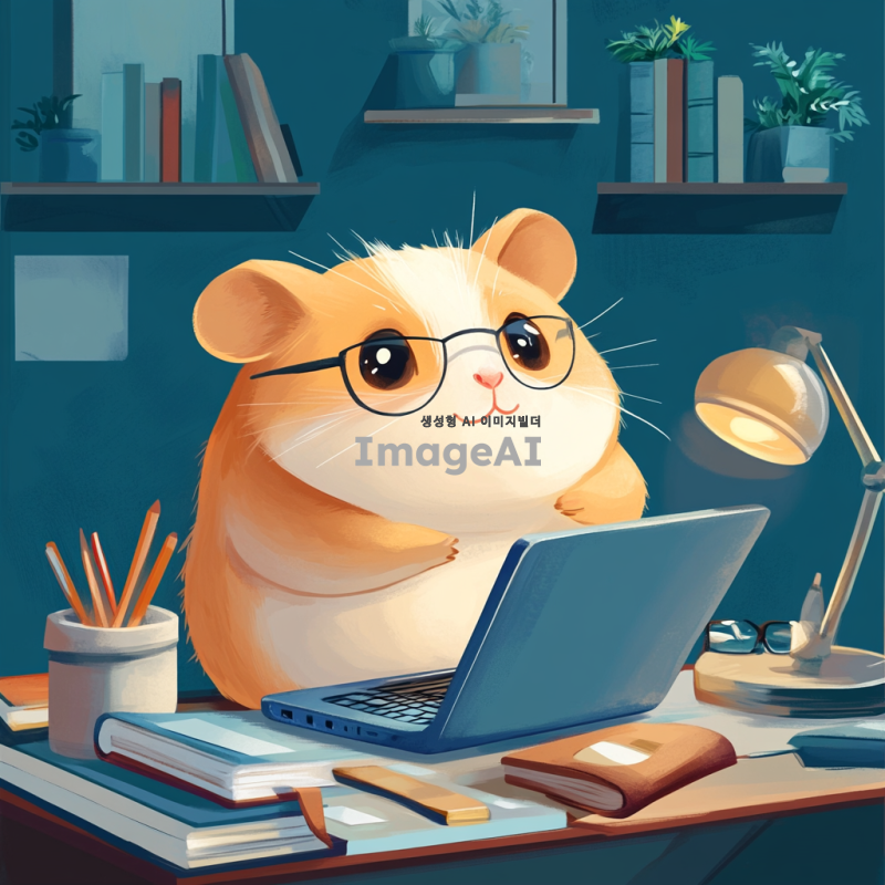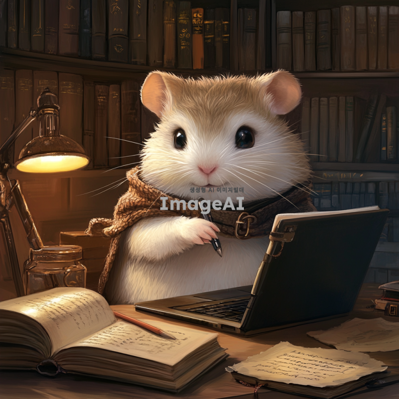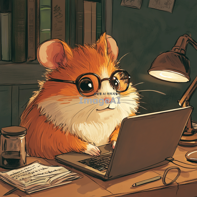 지적여 보이는 햄스터 캐릭터가 기대 앉아 노트북을 활용해 글을 쓰고 있는 이미지.