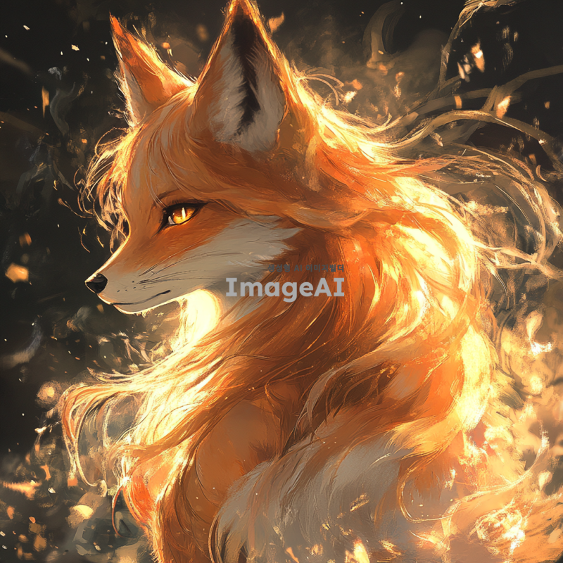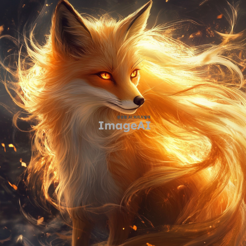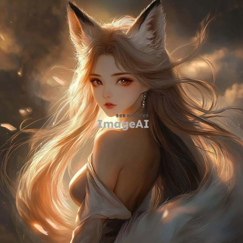 환상적으로 아름다운 얼굴의 구미호가 정면을 응시하고 있다. 그녀의 눈빛은 이성을 앗아갈 정도로 몽롱하고 매혹적이다. 긴 머리카락이 바람에 흩날리며, 주변에는 은은한 빛이 감돌고 있다. 신비로운 분위기를 자아내는 배경이 그녀의 매력을 더욱 돋보이게 한다.